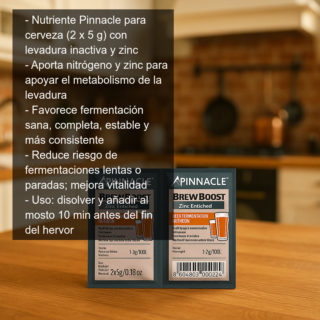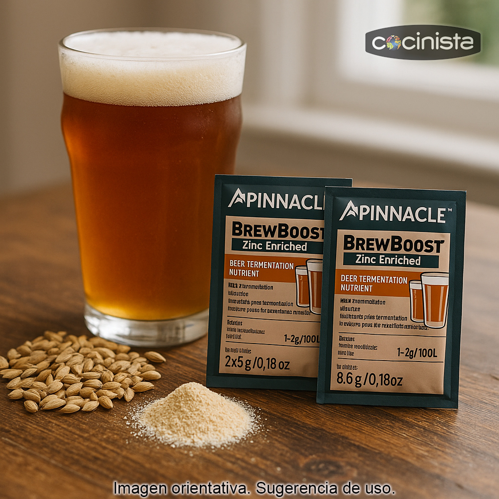 Nutriente Pinnacle para cerveza (2 x 5 g) a base de levadura inactiva enriquecida con zinc, un mineral clave para favorecer una fermentación sana, completa y estable. Este nutriente aporta fuentes de nitrógeno y zinc que ayudan a la levadura a trabajar en mejores condiciones, especialmente en mostos exigentes o cuando se busca un perfil final más limpio.
