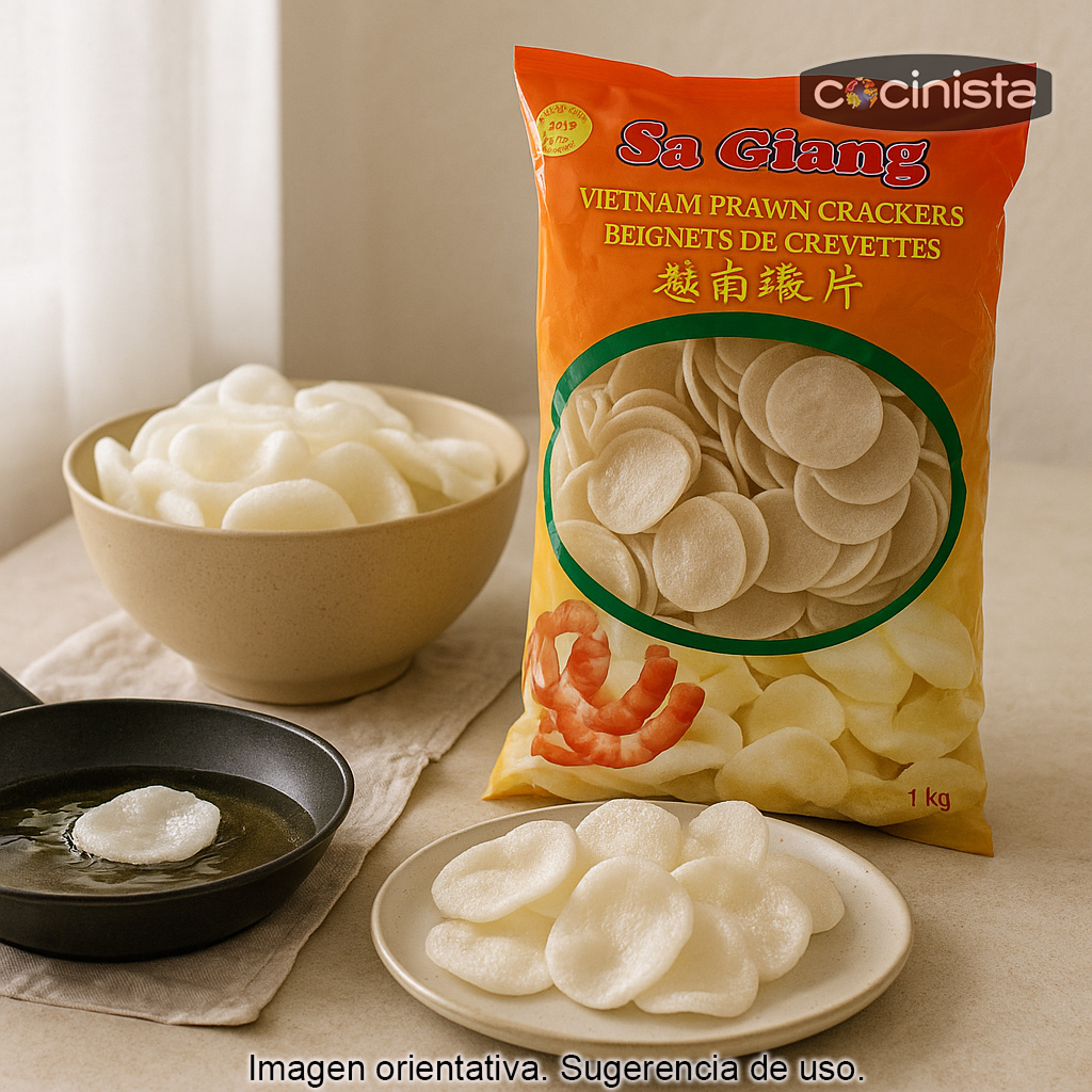 Las obleas de pan de gambas sin freír son la base perfecta para preparar en casa el clásico pan de gambas crujiente que se sirve en muchos restaurantes asiáticos. Al venir en formato de oblea deshidratada, se expanden al instante al contacto con el aceite caliente, quedando ligeras, aireadas y muy crujientes, ideales para un aperitivo rápido y recién hecho.