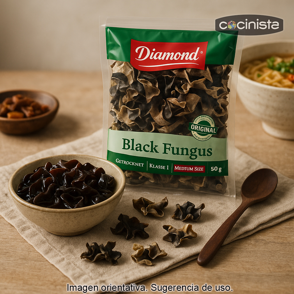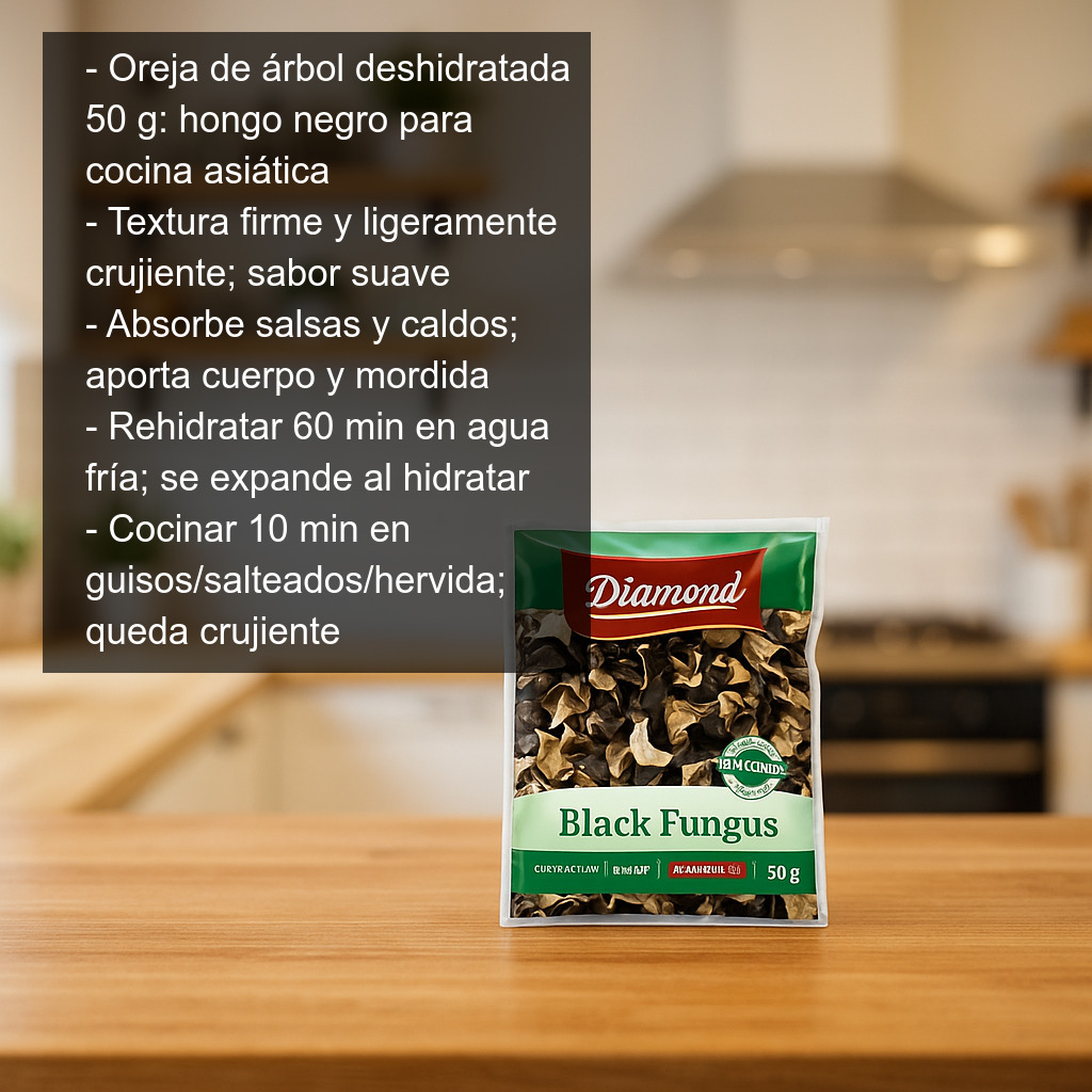 La oreja de árbol (también conocida como oreja de madera, oreja de Judas o hongo negro) es un hongo muy apreciado en la cocina asiática, especialmente en la gastronomía china, por su textura firme y ligeramente crujiente y su capacidad para absorber salsas y caldos. Su sabor es suave, por lo que resulta ideal para aportar cuerpo, contraste y mordida a sopas, salteados y guisos.