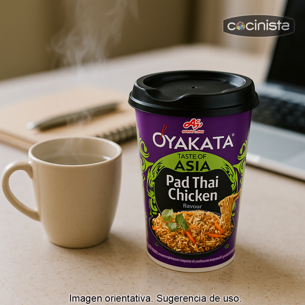 Este Pad Thai de pollo es de la marca Oyakata, una división de la prestigiosa firma japonesa Ajinomoto. Su formato “cup” facilita una preparación limpia y cómoda, con un resultado sabroso y aromático, pensado para quienes buscan una comida rápida sin renunciar al sabor.
