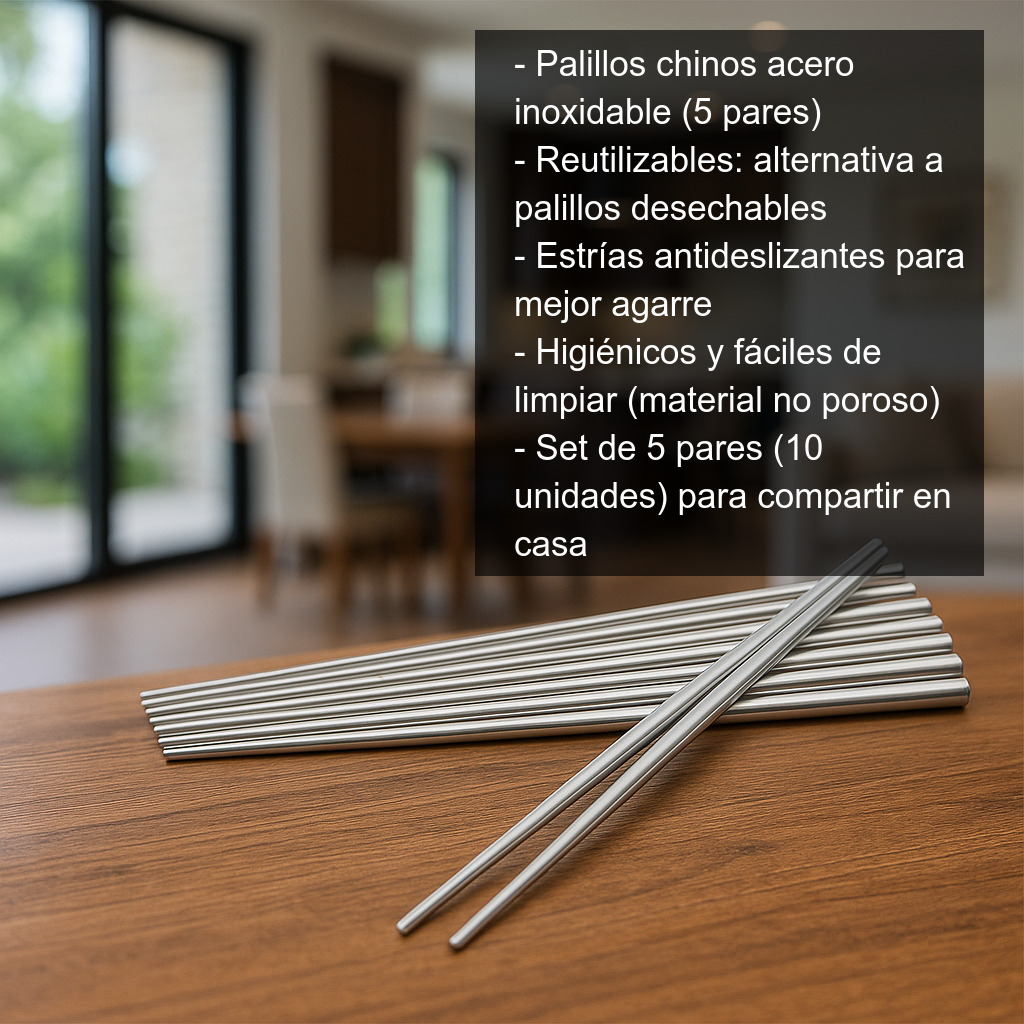 5 pares de palillos de acero inoxidable (10 unidades), pensados para compartir en familia o con invitados y mantener siempre un juego listo para tus cenas temáticas.