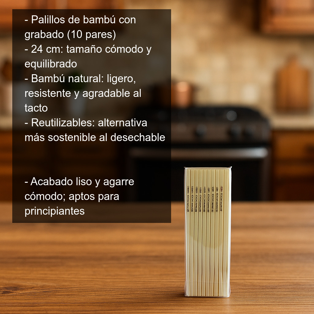 Paquete de palillos de bambú (palillos chinos) con grabado decorativo en la parte superior. Con una longitud de 24 cm, ofrecen un tamaño cómodo y equilibrado para comer con precisión y disfrutar de una experiencia más auténtica en la mesa.