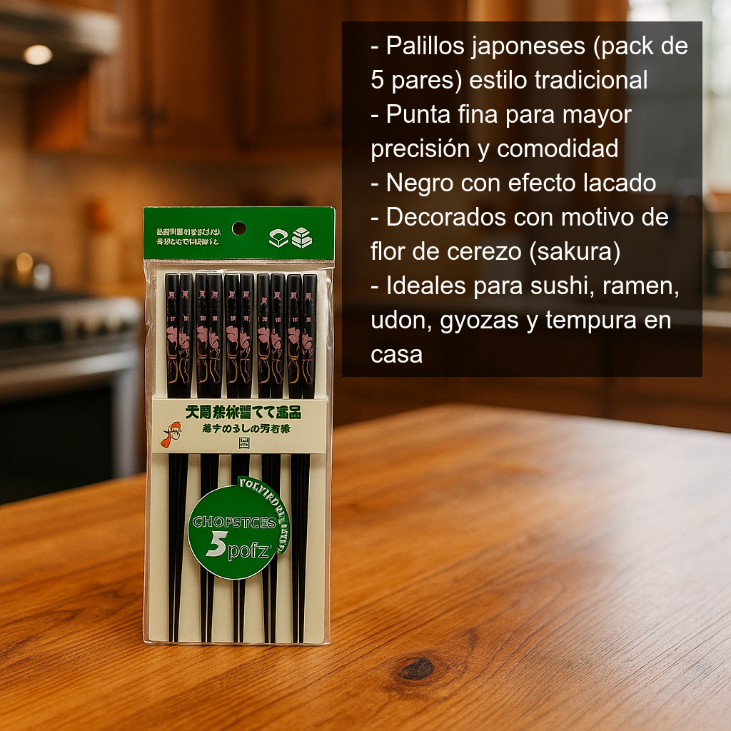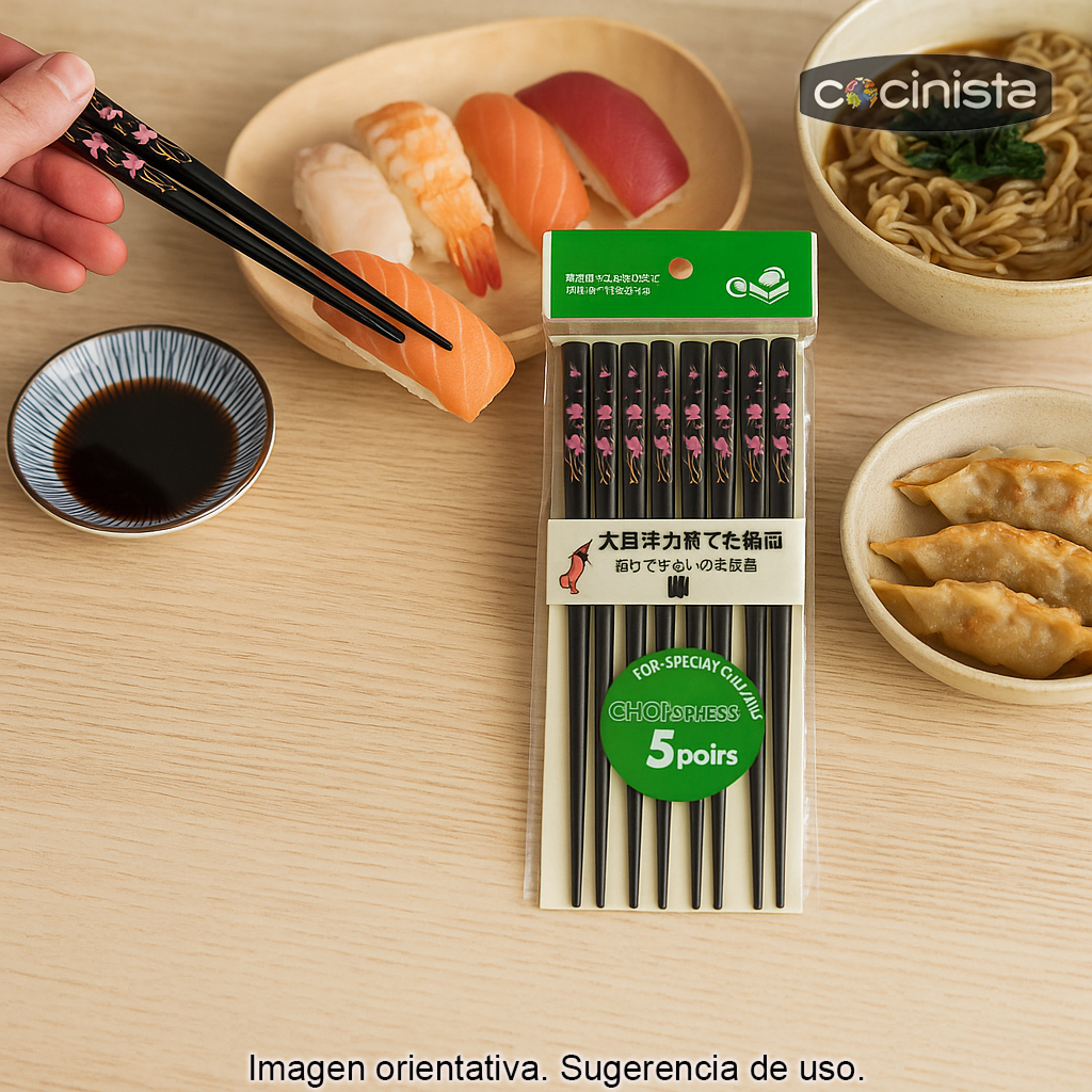 Palillos japoneses (pack de 5 pares) de estilo tradicional, ideales para disfrutar de sushi, ramen, udon, gyozas, tempura y todo tipo de cocina asiática en casa. A diferencia de los palillos chinos, estos palillos de estilo japonés se caracterizan por su punta fina, que facilita coger piezas pequeñas con mayor precisión y comodidad.