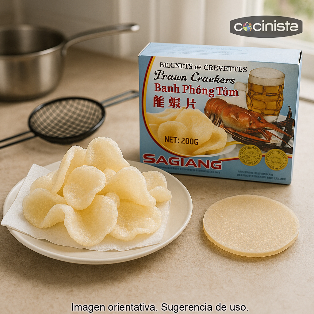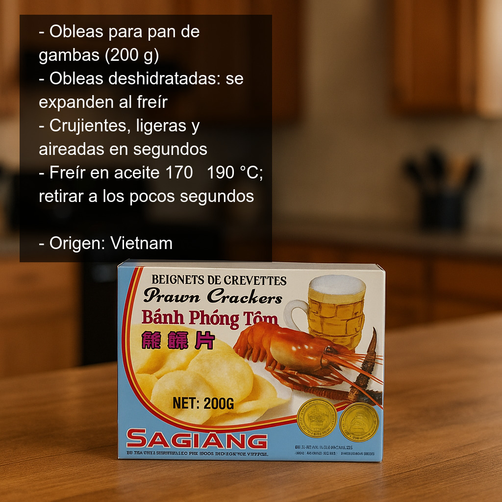 Estas obleas para pan de gambas (200 g) son el ingrediente imprescindible para preparar en casa el clásico pan de gambas crujiente que se sirve en muchos restaurantes asiáticos. Son obleas deshidratadas que, al contacto con aceite muy caliente, se expanden en segundos y quedan ligeras, aireadas y muy crujientes.