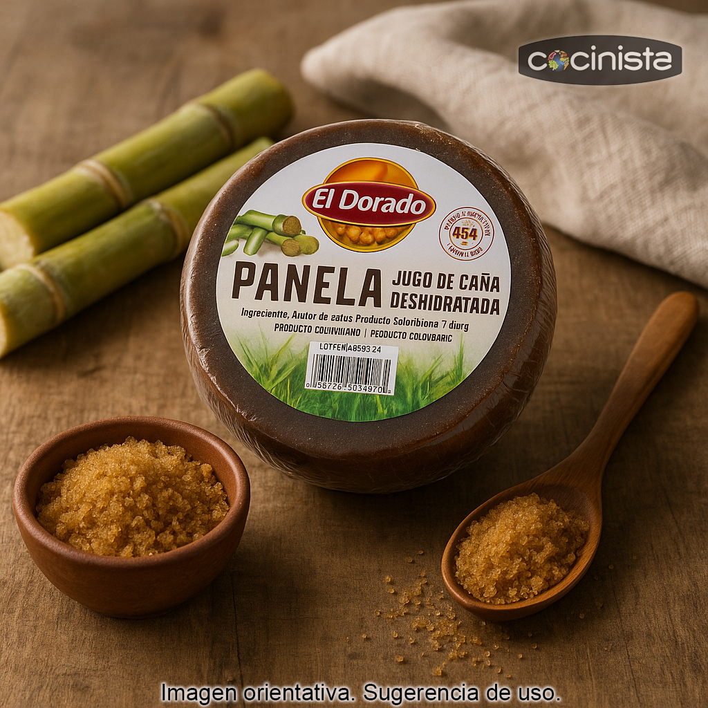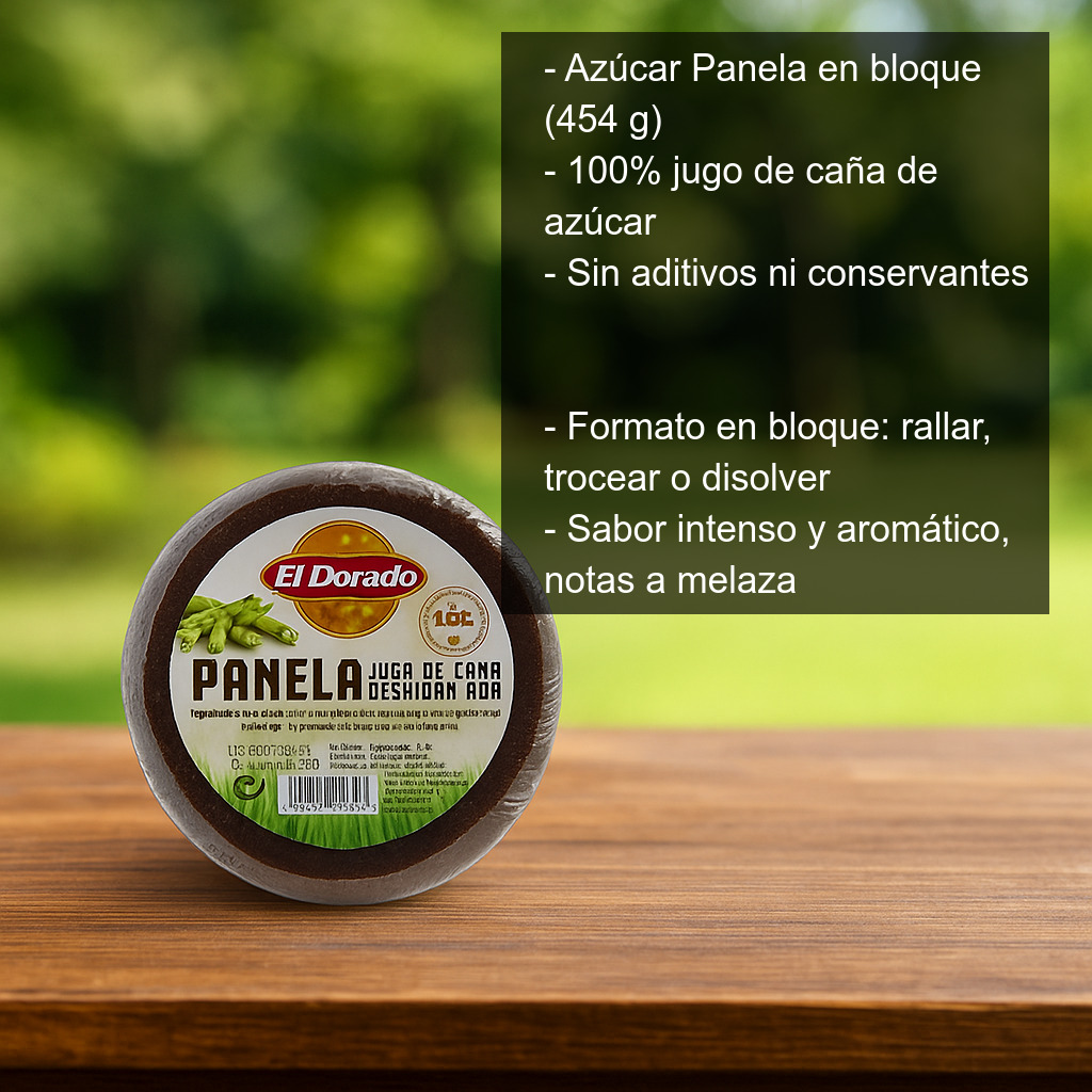 Azúcar Panela en bloque (454 g) elaborado a partir del jugo de caña de azúcar y sin aditivos. La panela (también conocida como panela colombiana, piloncillo o rapadura según el país) es un endulzante tradicional obtenido mediante la cocción y concentración del jugo de caña hasta su solidificación. El resultado es un azúcar integral con un sabor característico, más aromático y profundo que el azúcar blanco.