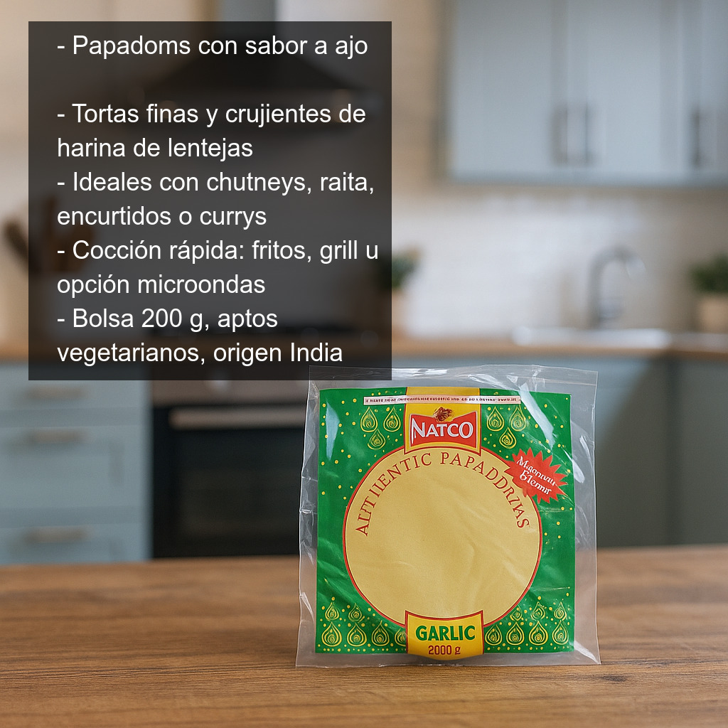 Los papadoms con sabor a ajo (también conocidos como pappadums o papad) son unas finas tortas crujientes típicas de la cocina india, elaboradas a base de harina de lentejas y aromatizadas con ajo. Su textura ligera y su sabor intenso los convierten en el acompañamiento perfecto para dar un toque exótico y muy crujiente a tus comidas.