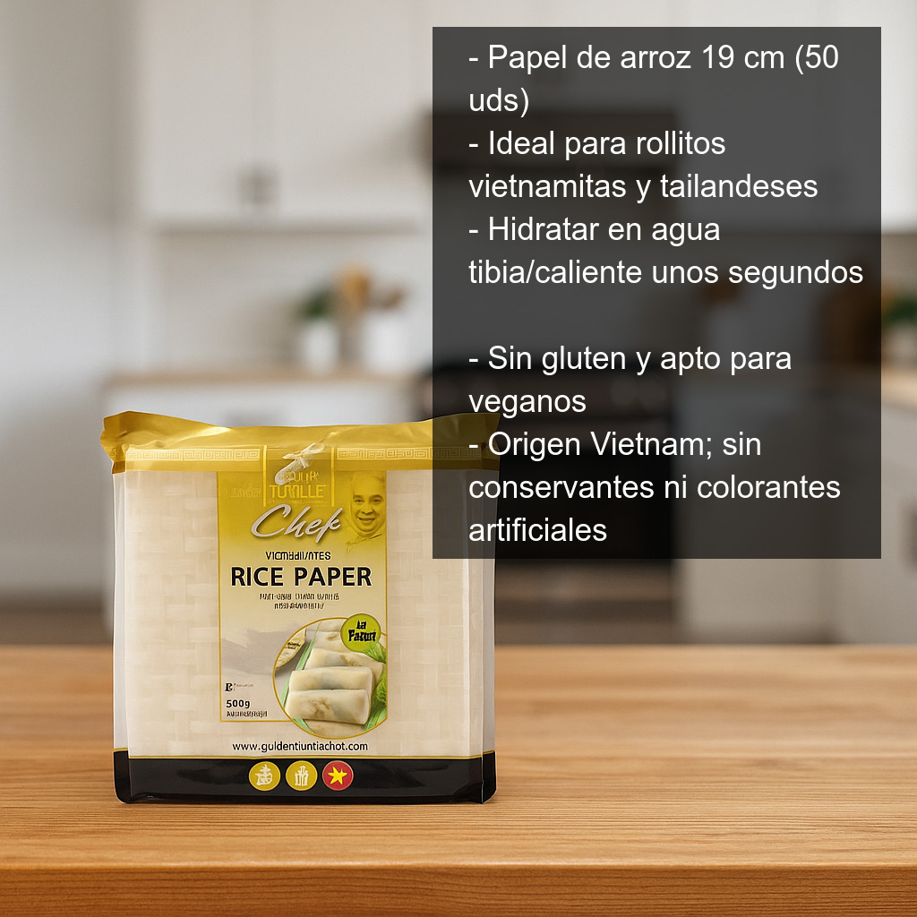 El papel de arroz (también conocido como rice paper) es un ingrediente imprescindible de la cocina del Sudeste Asiático, especialmente en recetas vietnamitas y tailandesas. Estas láminas redondas de 19 cm son perfectas para preparar en casa rollitos vietnamitas (fresh spring rolls), rollitos de verano y otras elaboraciones tanto frías como calientes. Con este formato de 50 unidades tendrás cantidad suficiente para varias comidas, cenas o para preparar aperitivos para invitados.