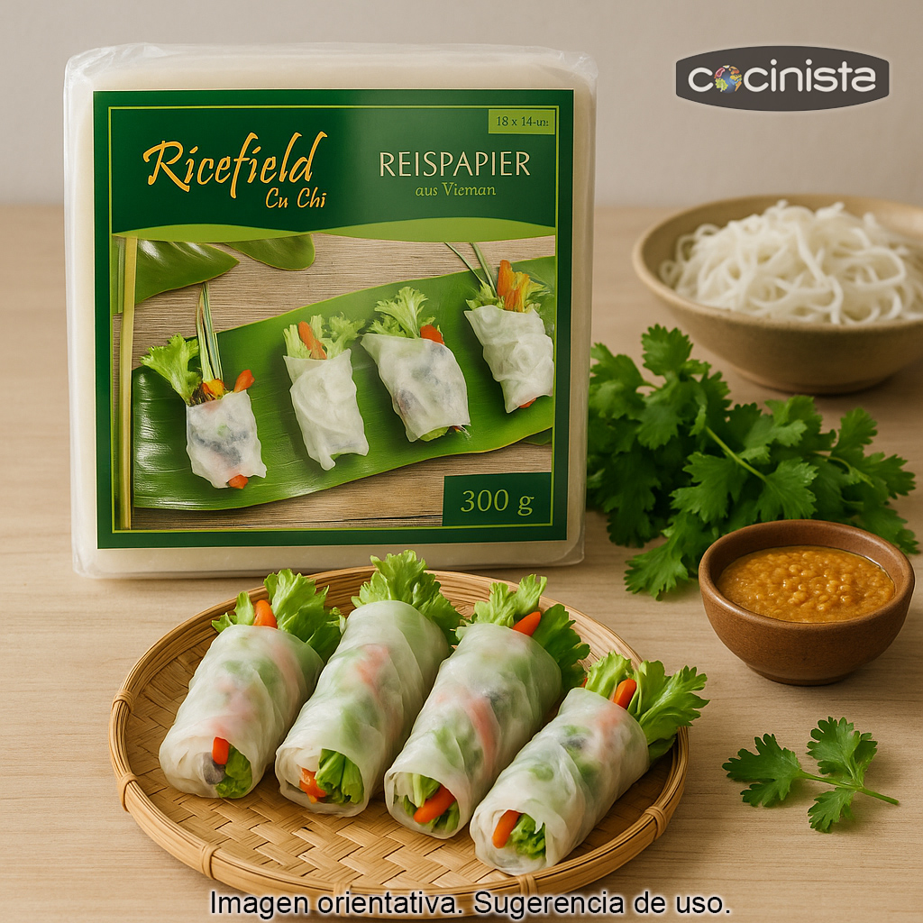 Su textura fina y flexible, una vez hidratada, permite envolver fácilmente verduras, fideos, marisco, pollo, tofu o setas, logrando un acabado limpio y uniforme. Al ser papel de arroz para rollitos, es perfecto tanto para preparaciones frías como para cocinados rápidos.