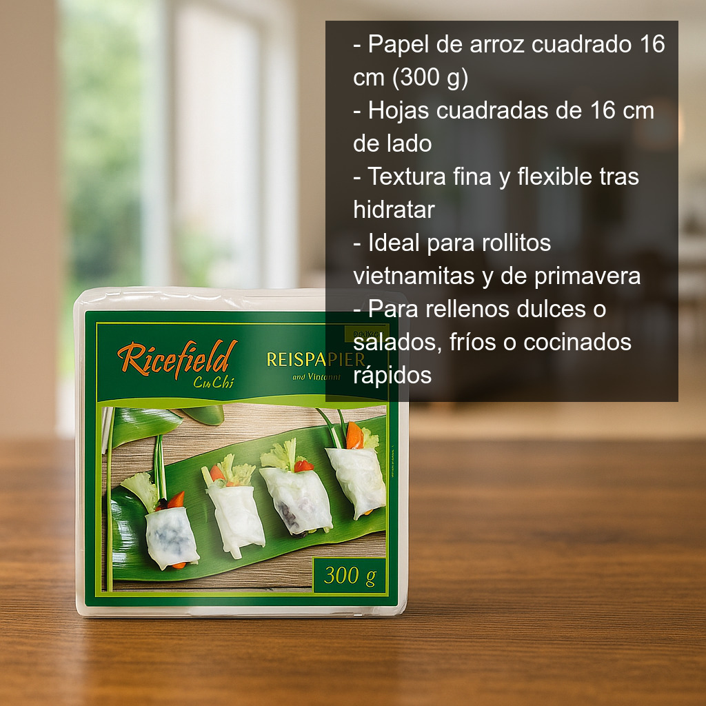 El papel de arroz cuadrado de 16 cm es un ingrediente imprescindible para preparar en casa recetas asiáticas auténticas. Esta bolsa contiene 300 g de hojas de papel de arroz en formato cuadrado, ideales por su tamaño para hacer rollitos vietnamitas (fresh rolls), rollitos de primavera y otras elaboraciones creativas con rellenos dulces o salados.