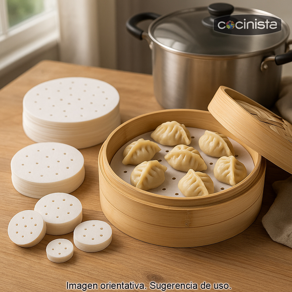 El papel para vaporera de 15 cm es el accesorio imprescindible para cocinar al vapor de forma limpia y cómoda en vaporeras de bambú o vaporeras metálicas. Estas hojas redondas actúan como separador antiadherente, evitando que preparaciones delicadas se rompan o se queden pegadas a la base durante la cocción.