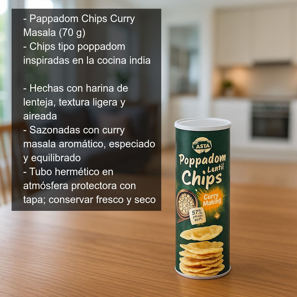 Estos chips de poppadom tienen un diámetro de algo menos de 9 cm y destacan por su finura y su textura aireada. Son ideales para quienes buscan un snack diferente, con un toque especiado, perfecto tanto para picar entre horas como para acompañar una mesa de aperitivos.