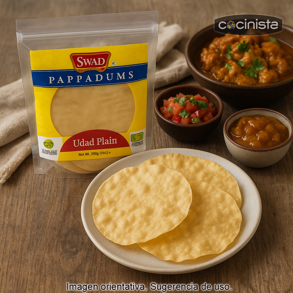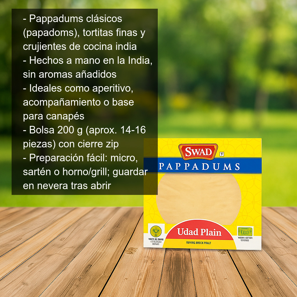 Los pappadums (también conocidos como papadoms) son unas finas y crujientes tortitas tradicionales de la cocina india, perfectas para servir como aperitivo, acompañamiento o base para canapés. Estos pappadums clásicos se elaboran a mano en la India y no llevan aromas añadidos, para que disfrutes de su sabor auténtico y su textura ligera y muy crujiente.