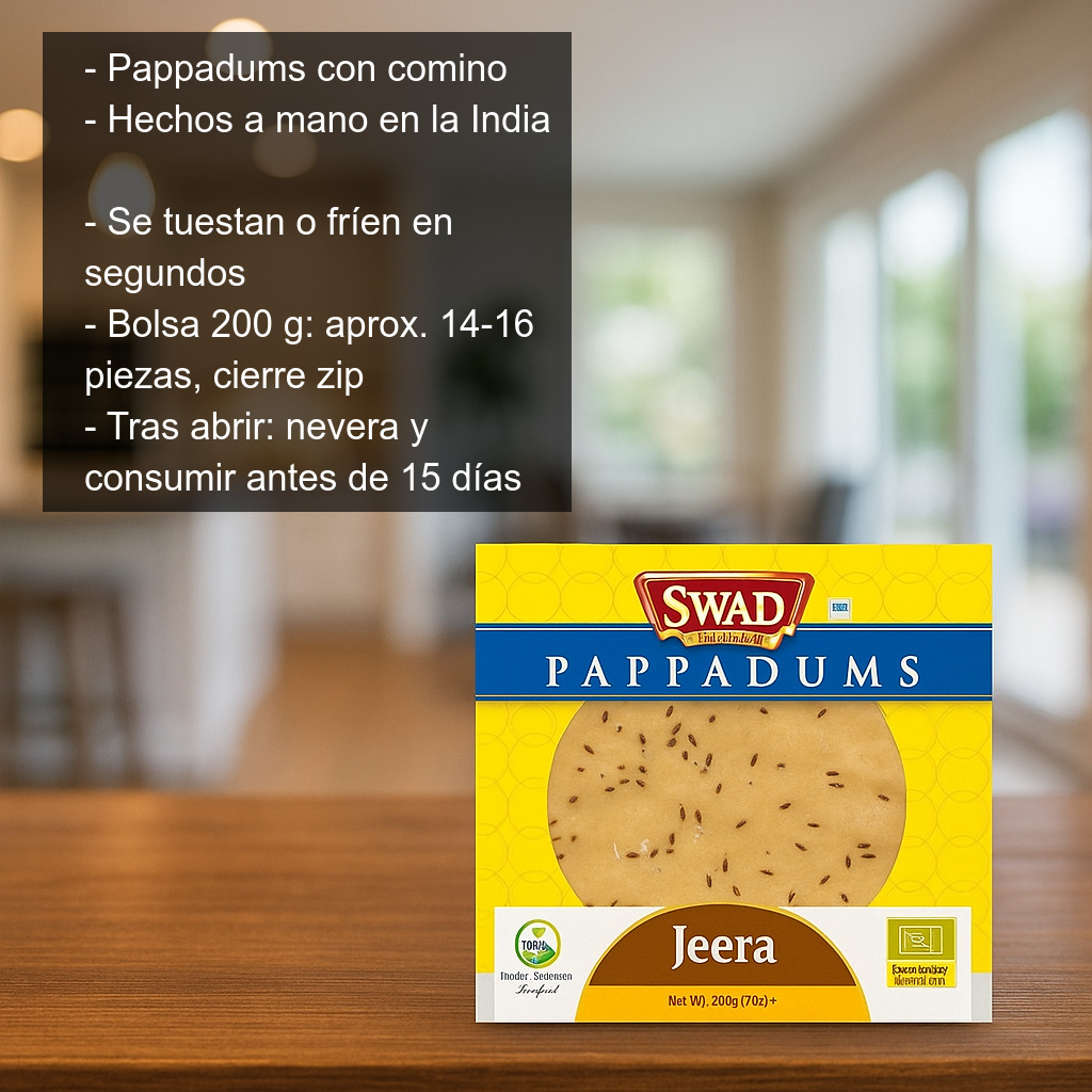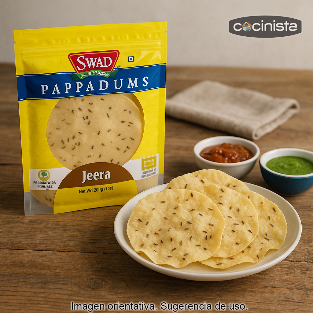 Pappadums (o papadoms) con comino, elaborados a mano en la India, ideales para disfrutar de un aperitivo indio crujiente y lleno de sabor. Estas finas obleas tradicionales, muy populares en la cocina india, se tuestan o fríen en segundos y quedan ligeras, doradas y con ese toque aromático del comino que combina a la perfección con salsas, chutneys y dips.
