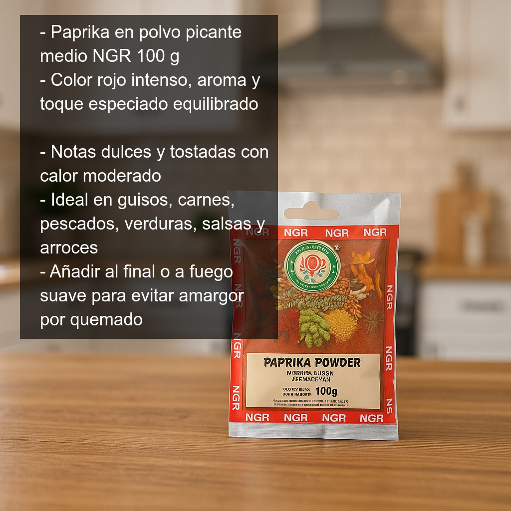 Este paprika en polvo se sirve en bolsa de 100 g. Es de la marca NGR, con sede en Alemania y especializada en la importación de especias procedentes de la India y otros países de origen.