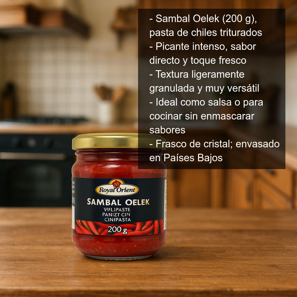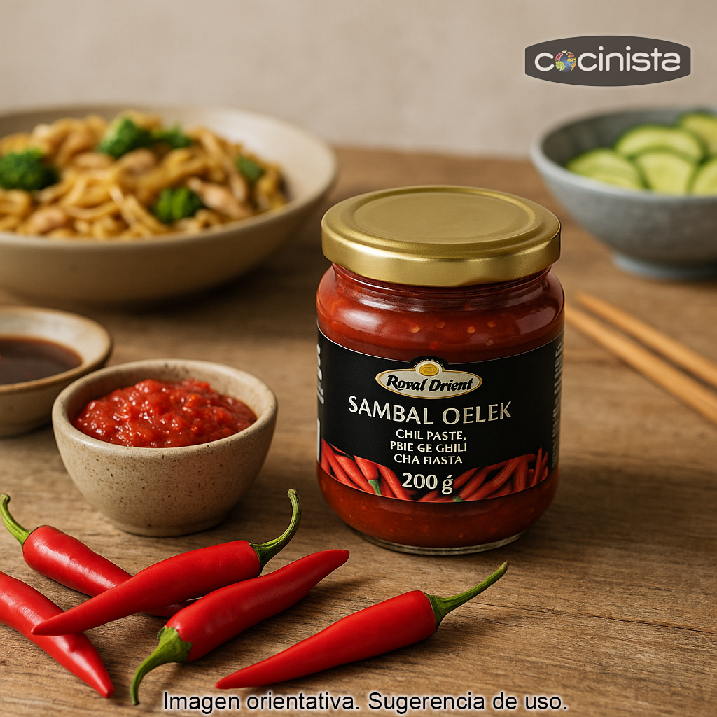 El Sambal Oelek es una pasta de chiles tradicional muy popular en la cocina del Sudeste Asiático (especialmente en Indonesia) y ampliamente utilizada en otros países asiáticos. Se elabora a partir de chile triturado, lo que le da una textura ligeramente granulada y un sabor directo e intenso: picante, con un toque fresco y muy versátil para cocinar.