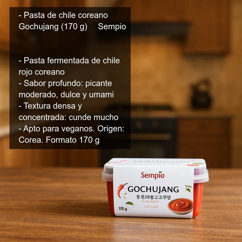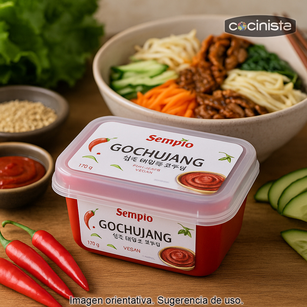 Su textura es densa y concentrada, por lo que cunde mucho: basta una pequeña cantidad para transformar salsas, marinados y salteados. Es un ingrediente imprescindible para preparar clásicos como bibimbap, tteokbokki (pasteles de arroz), kimchi jjigae (estofado) o para crear salsas rápidas para verduras, tofu, noodles o arroz.
