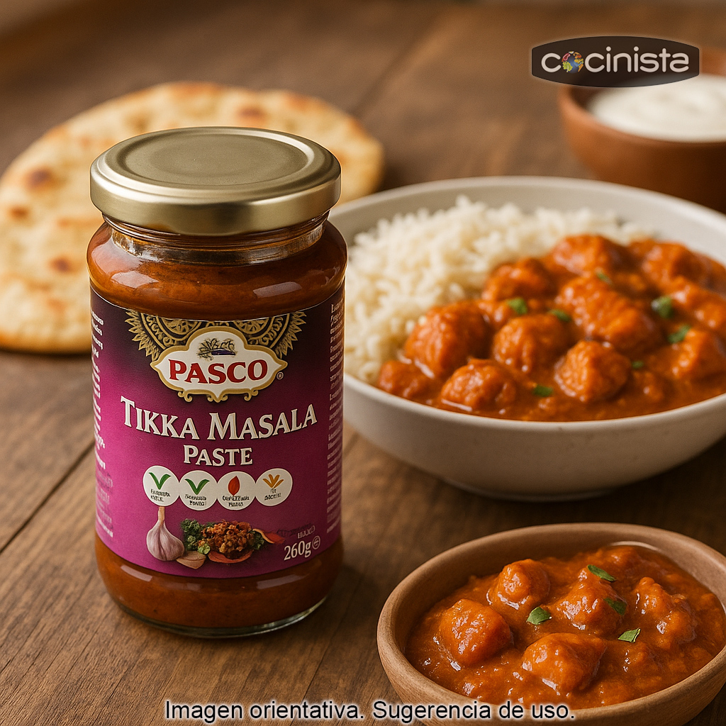 Esta pasta está pensada para conseguir ese perfil tan característico del tikka masala, donde las especias se integran con una base suave. En la receta final suele realzarse con leche de coco y/o yogur (según preferencias), logrando una salsa sedosa y muy fragante, perfecta para acompañar con arroz basmati, pan naan o chapati.