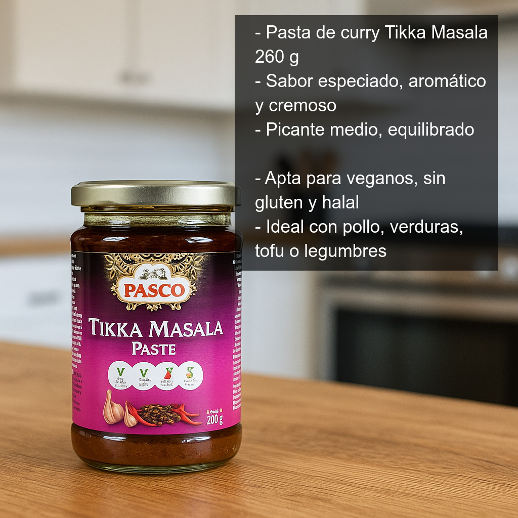 - Uso recomendado: pollo tikka masala, tikka masala vegano, curry de garbanzos, verduras al curry, tofu al tikka masala.