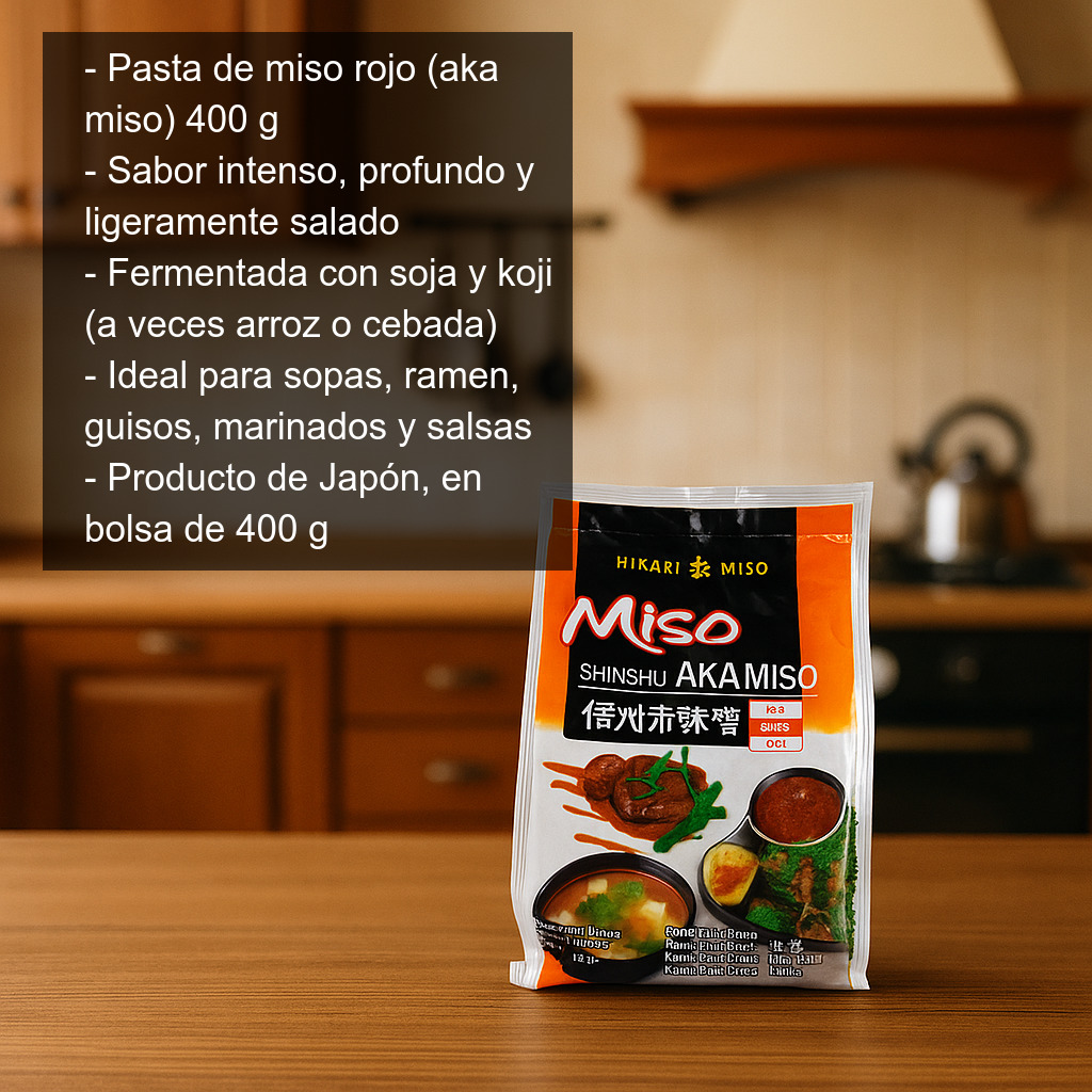 Se presenta en bolsa con 400 g de pasta de miso rojo.