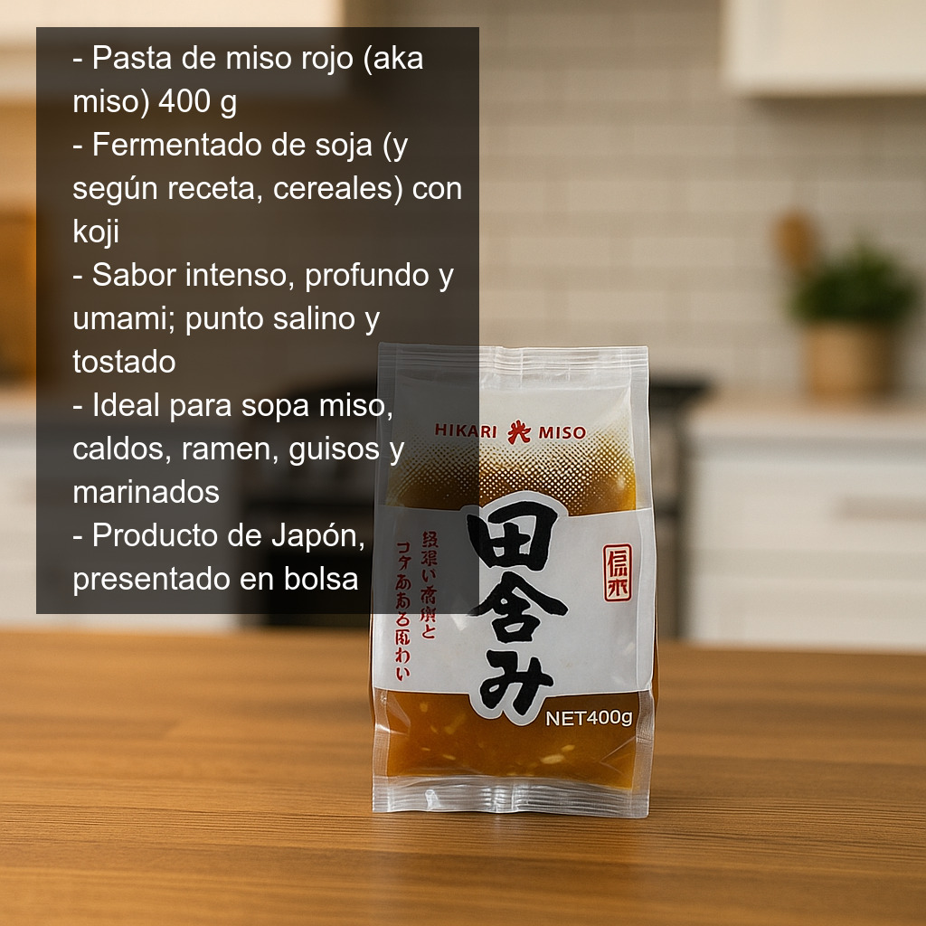 Se presenta en bolsa con 400 g de pasta de miso rojo.