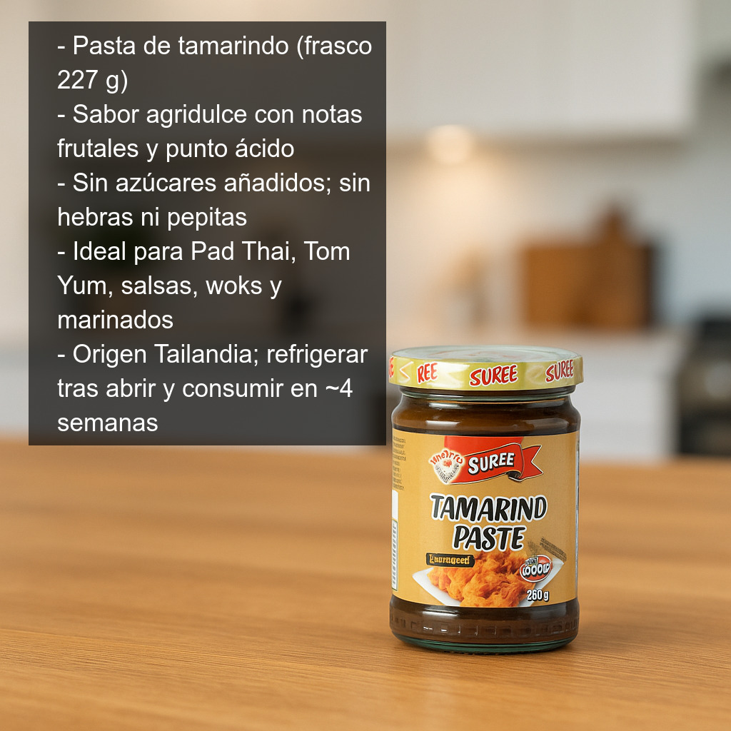 La pasta de tamarindo es un ingrediente esencial en la cocina tailandesa y en muchas recetas de la gastronomía asiática. Aporta un sabor característico agridulce, con notas frutales y un punto ácido que equilibra a la perfección platos salados, picantes y aromáticos. Esta pasta de tamarindo en frasco de 227 g es muy práctica para cocinar en casa: viene sin azúcares añadidos y está libre de hebras o pepitas, lo que facilita su uso directo en salsas, caldos y marinados.