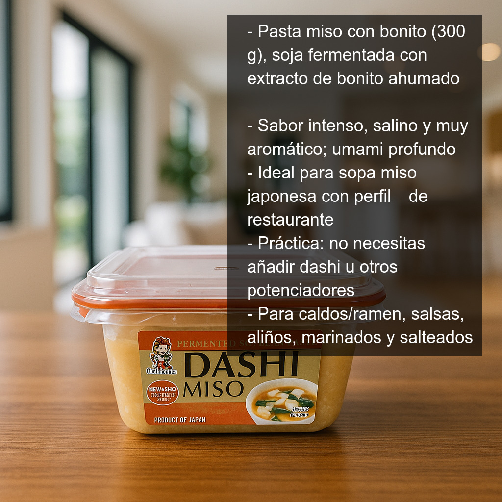 Esta versión de miso ya incorpora el toque de bonito ahumado, por lo que resulta especialmente práctica: no necesitas añadir dashi u otros potenciadores para conseguir ese perfil tradicional. Su sabor es intenso, salino y muy aromático, ideal para quienes buscan una sopa miso “de restaurante” con el mínimo esfuerzo.