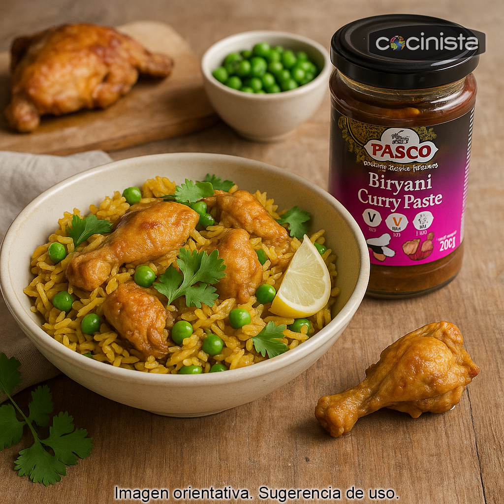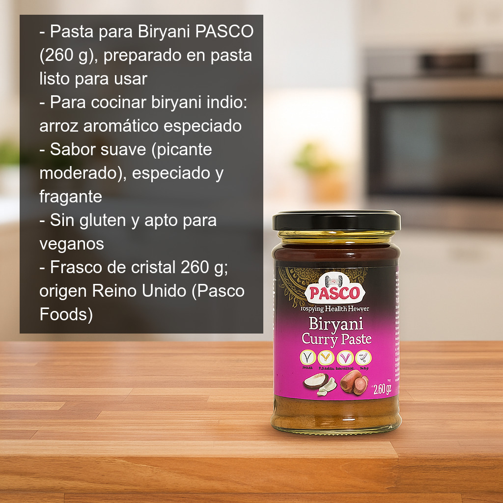 La Pasta para Biryani PASCO (260 g) es un preparado en pasta listo para usar que te permite cocinar en casa un auténtico biryani indio: el famoso arroz aromático especiado típico de la India, ideal para combinar con verduras, pollo, cordero o langostinos. Con esta pasta conseguirás el sabor característico del biryani de forma rápida y consistente, sin necesidad de mezclar muchas especias por separado.