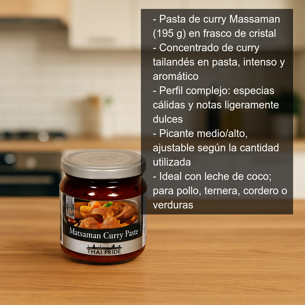 Esta pasta está pensada para recetas de curry Massaman de pollo, curry Massaman de ternera o cordero, aunque también funciona muy bien con verduras, tofu o setas. Aporta un nivel de picante medio/alto (ajustable según la cantidad utilizada) y un aroma profundo que transforma guisos, salteados y salsas.