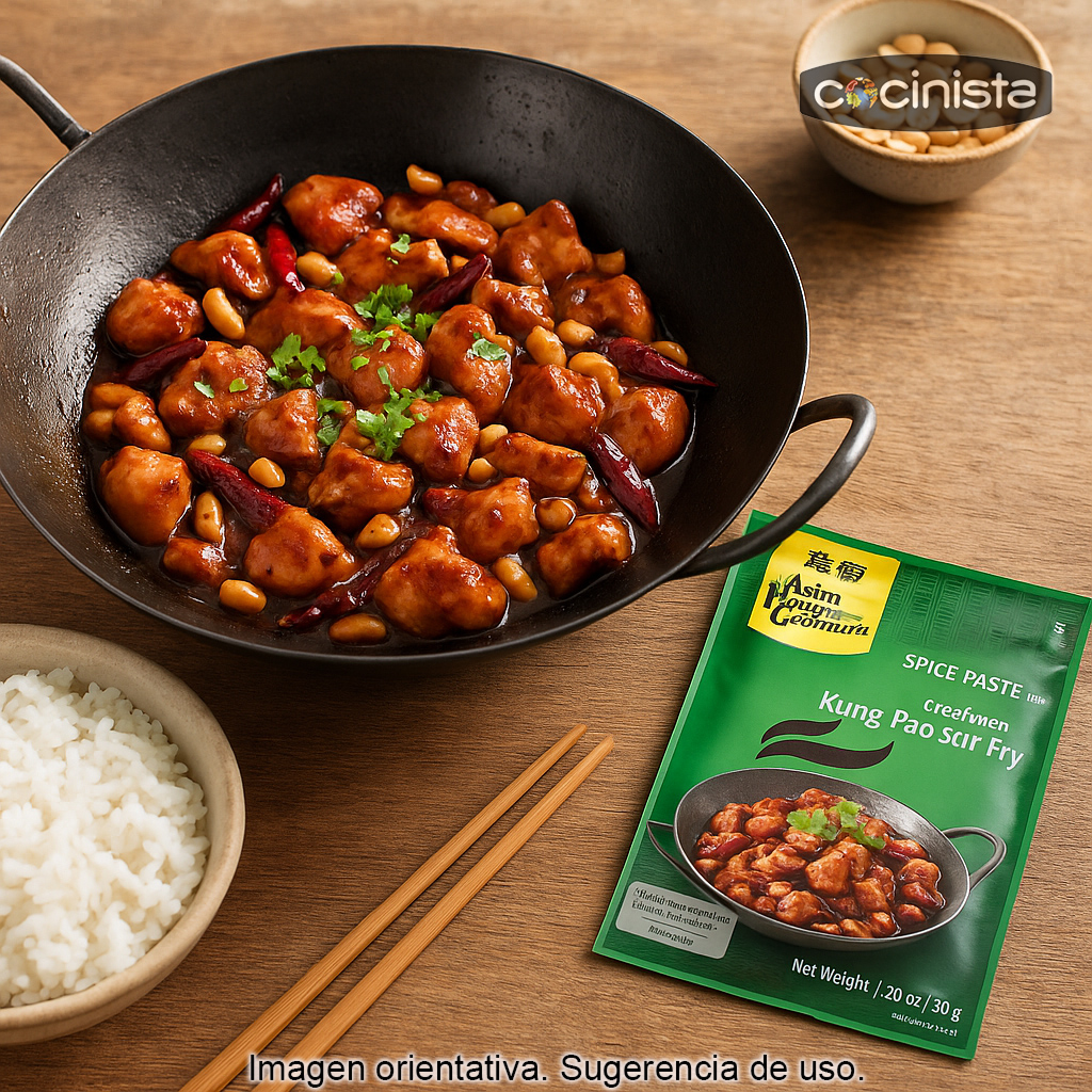 Este preparado está pensado para que puedas lograr el clásico equilibrio del Kung Pao: pollo salteado a fuego vivo, salsa especiada y un toque crujiente de frutos secos. Es una opción perfecta para quienes buscan cocina asiática en casa con resultados consistentes, sin complicarse con muchas especias o salsas distintas.