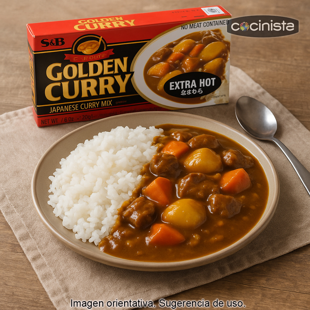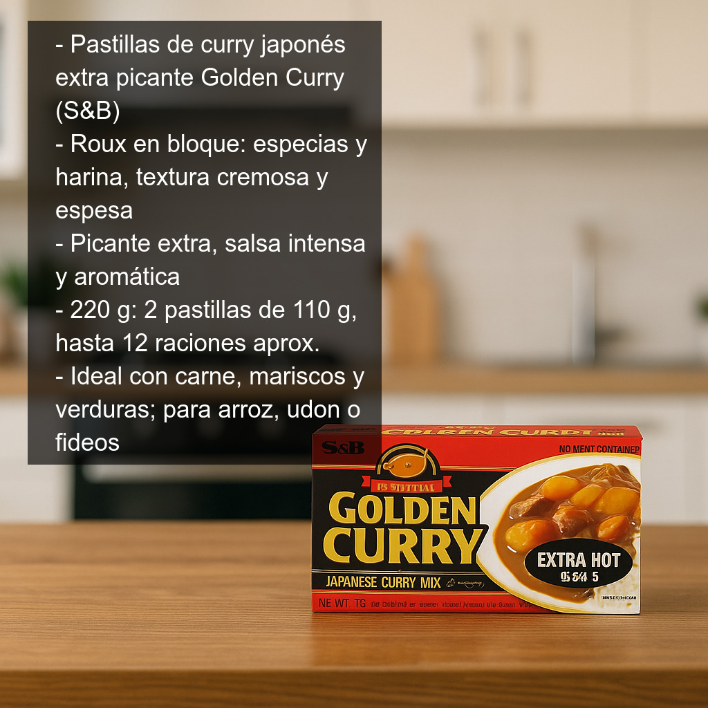 Las pastillas de curry japonés extra picante Golden Curry (S&B) son un roux en formato bloque (mezcla de especias y harina) pensado para preparar en casa un auténtico curry japonés con una textura cremosa y espesa. Solo tienes que disolver el roux en el caldo del guiso para conseguir una salsa intensa, aromática y con un picante alto, ideal para quienes buscan un curry con carácter.