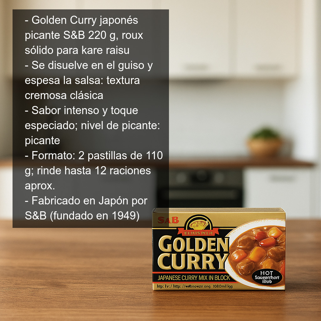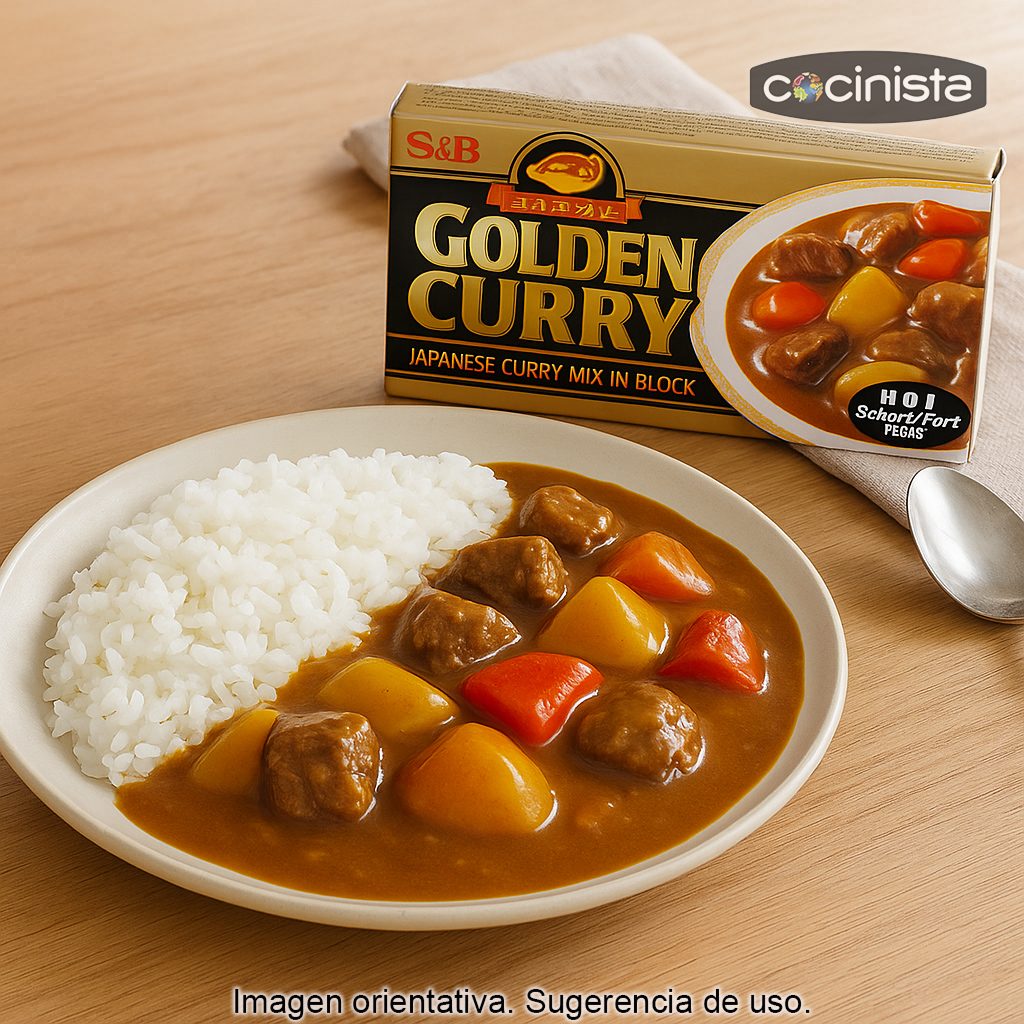 Las pastillas de curry japonés picante Golden Curry (220 g) son un roux de curry en formato sólido, ideal para preparar en casa un auténtico curry japonés (kare raisu) de forma rápida y con un resultado cremoso. Al disolverse en el caldo del guiso, este roux aporta sabor intenso, un toque especiado característico y espesa la salsa hasta conseguir la textura clásica del curry japonés.