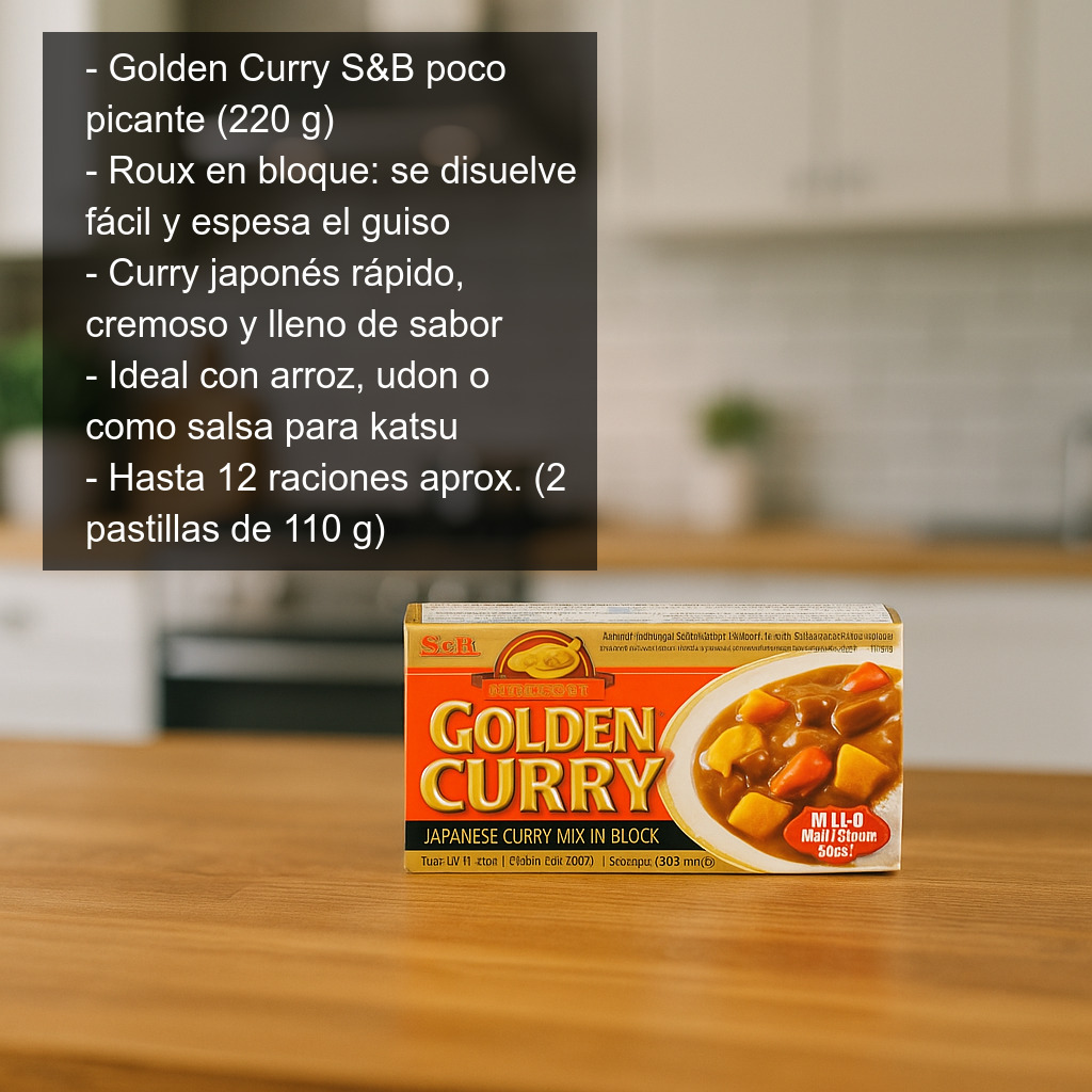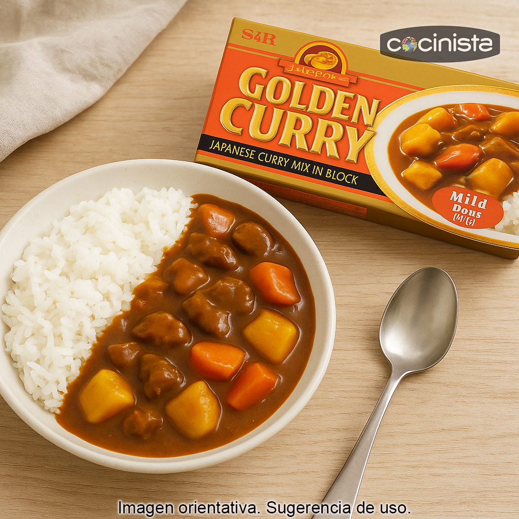 Las pastillas de curry japonés Golden Curry (S&B) poco picante son un roux en formato bloque, ideal para preparar en casa el clásico curry japonés de forma rápida y con un resultado cremoso y lleno de sabor. Al disolverse fácilmente en el caldo del guiso, aporta aroma especiado, cuerpo y una textura espesa característica, perfecta para servir con arroz blanco, fideos udon o incluso como salsa para katsu (tonkatsu o pollo empanado).