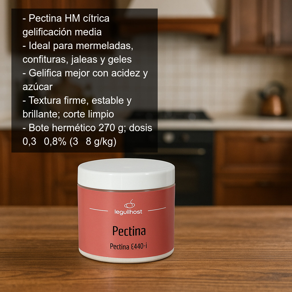 La pectina es un espesante y gelificante natural presente en muchas frutas (especialmente en la piel y las pepitas). Es un ingrediente imprescindible en repostería y conservas para conseguir una textura firme, estable y brillante, por lo que se utiliza ampliamente en la elaboración de mermeladas caseras, confituras, jaleas y geles de fruta.