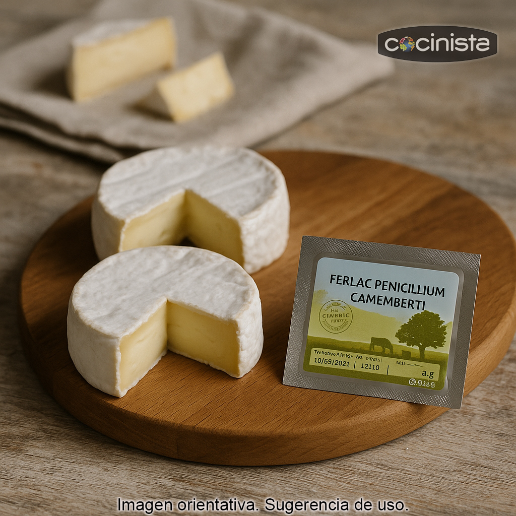 Este producto se presenta en sobre con 3 g de esporas de Penicillium camemberti, ideal para elaboraciones caseras y pequeñas producciones de quesos de corteza florida.