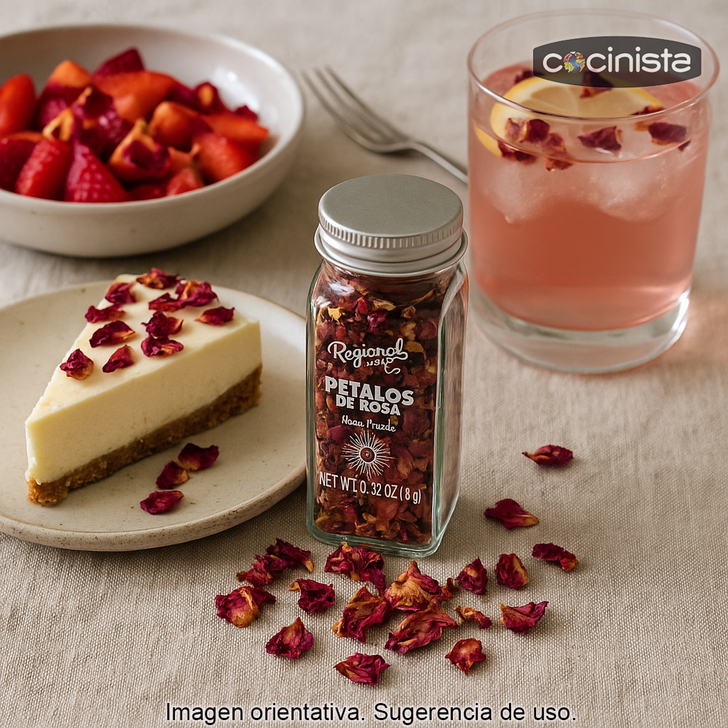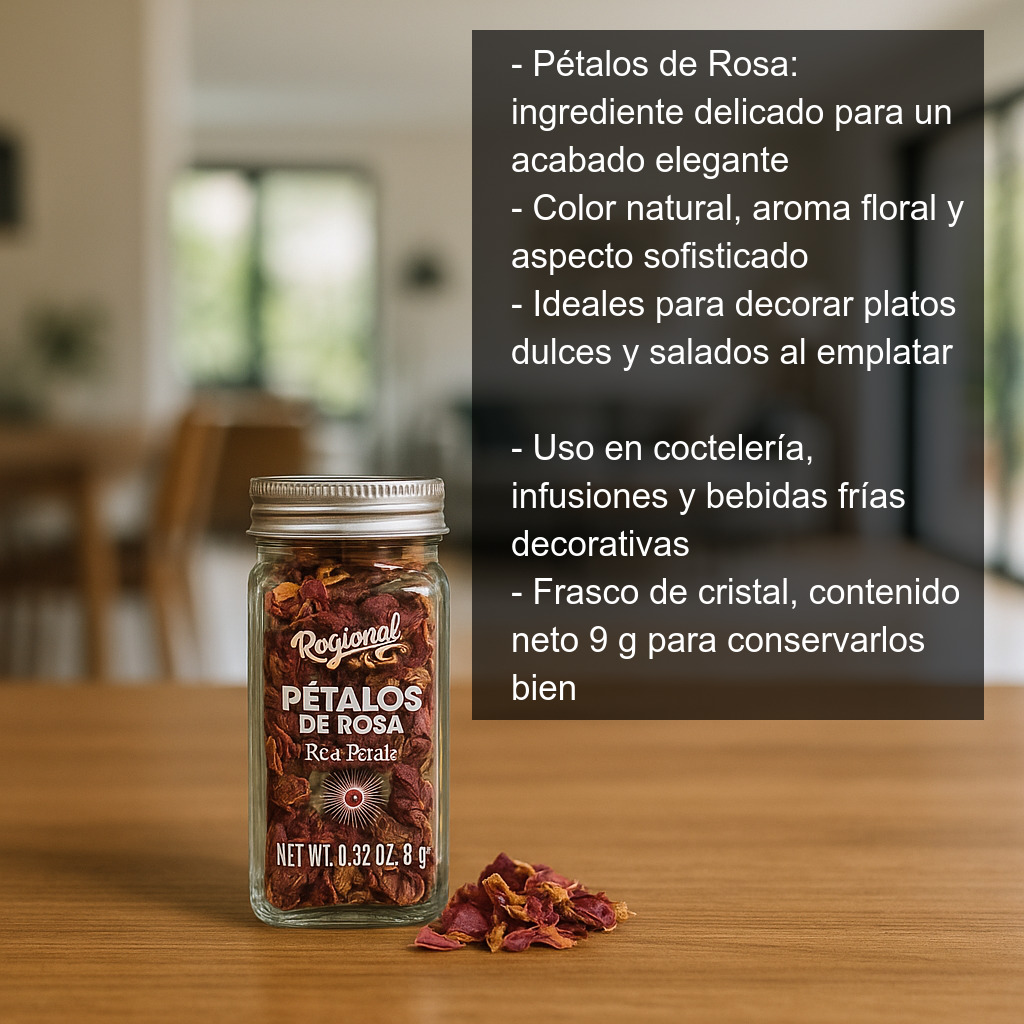 Los Pétalos de Rosa son un ingrediente delicado y muy versátil para dar un acabado elegante a tus recetas. Su color natural, su aroma floral y su aspecto sofisticado los convierten en un recurso perfecto tanto para decoración gastronómica como para elaboraciones donde se busca un toque sutil y aromático.
