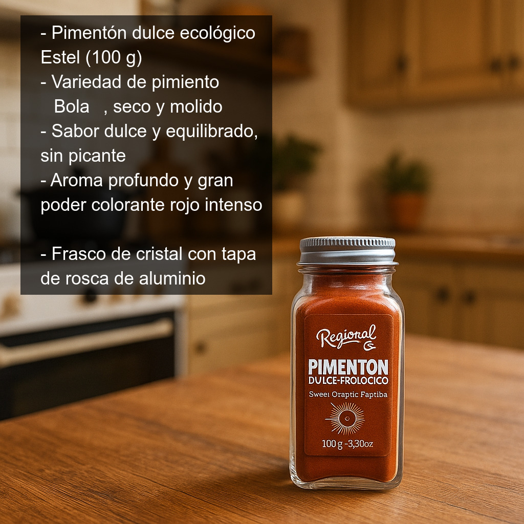 El pimentón dulce ecológico Estel (80 g) se elabora a partir de pimientos de la variedad “Bola”, que se secan y posteriormente se muelen para obtener un polvo fino de color rojo brillante e intenso. Destaca por su aroma profundo y penetrante, su gran poder colorante y un sabor dulce y equilibrado que realza cualquier receta sin aportar picor.