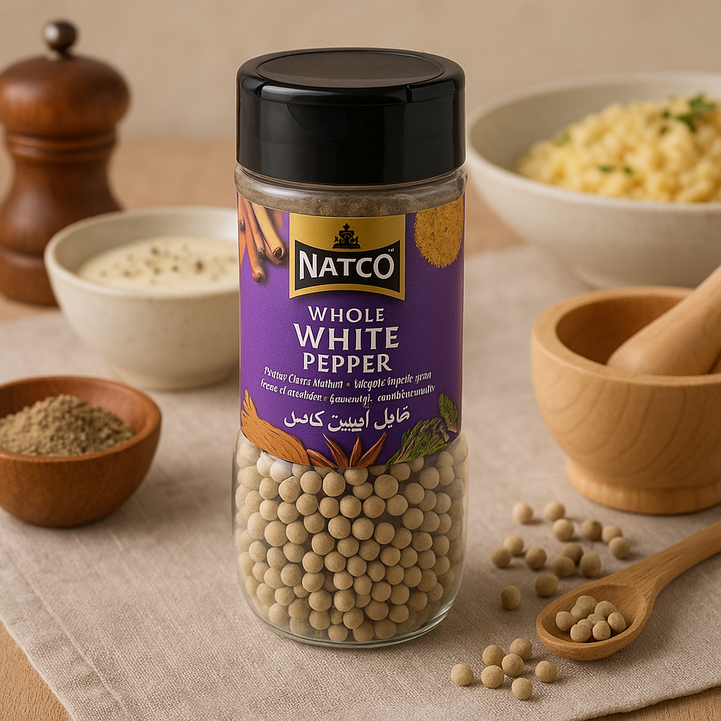 La pimienta blanca en grano es una especia imprescindible en cualquier cocina. Se obtiene del fruto maduro de Piper nigrum al que se le retira la piel exterior mediante un proceso de remojo y secado. Este método da como resultado un perfil aromático más cálido, suave y delicado que el de la pimienta negra, con un picor más redondeado y menos tostado.
