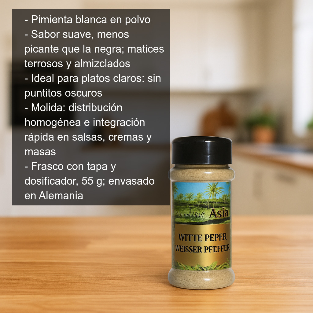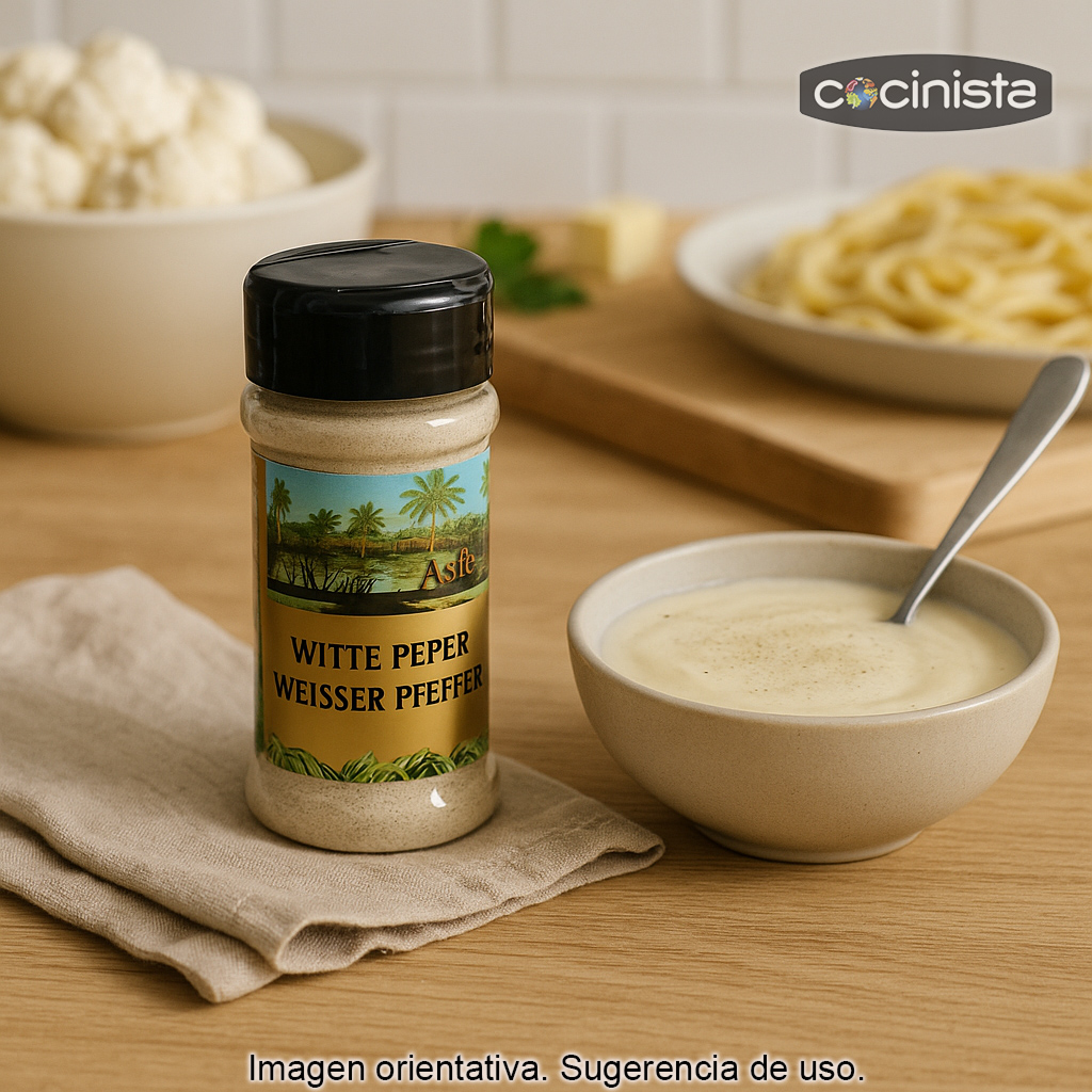 La pimienta blanca en polvo es una especia imprescindible para dar un toque aromático y elegante a tus recetas. Se obtiene a partir del grano maduro de pimienta al que se le retira la cáscara exterior antes del secado, lo que da como resultado un sabor más suave y menos picante que la pimienta negra, con matices terrosos y ligeramente almizclados. Es ideal cuando buscas un punto especiado sin que se vean puntitos oscuros en el plato.