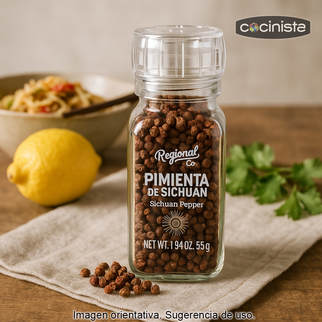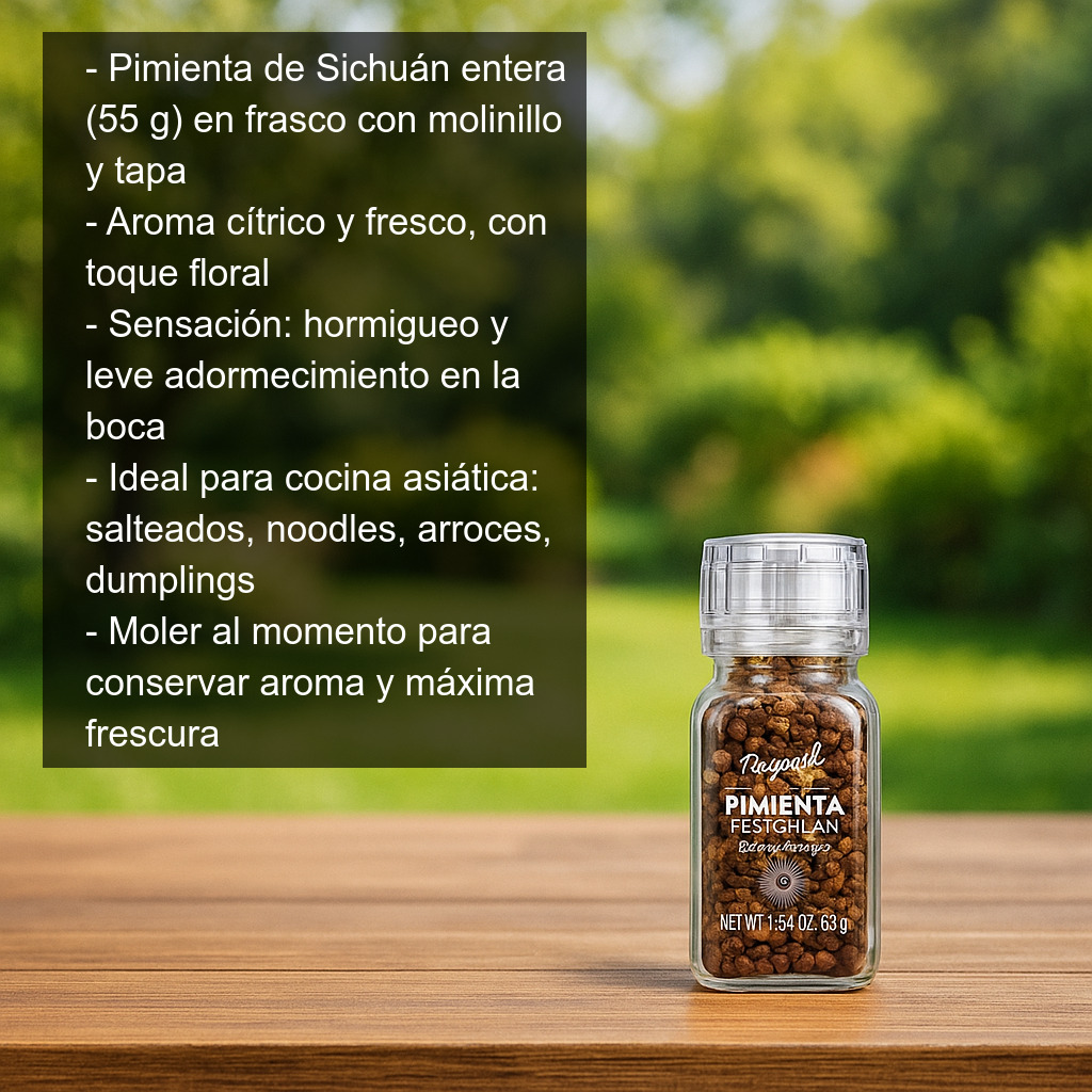 La pimienta de Sichuán (también conocida como pimienta china) es una especia imprescindible en la cocina asiática por su perfil aromático único: notas cítricas que recuerdan a la bergamota, un toque floral y un característico efecto ligeramente anestésico y hormigueante en la lengua (el famoso “ma la” de la gastronomía de Sichuán). No es una pimienta tradicional, sino la cáscara del fruto del Zanthoxylum, y aporta un sabor sorprendente que realza tanto platos salados como algunas preparaciones dulces.