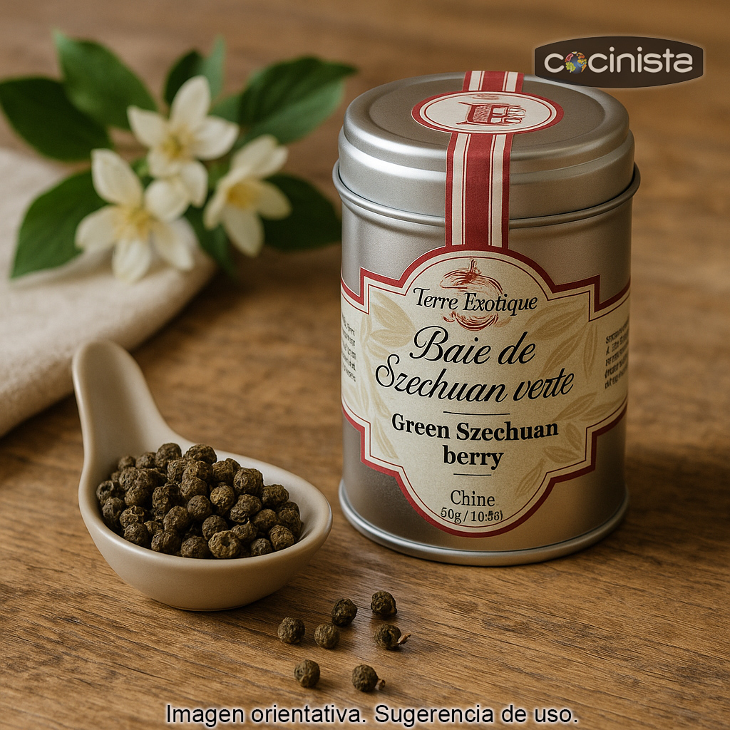 La baya de Sichuán verde destaca por su gran frescura y una fragancia floral cercana al jazmín, con matices afrutados y un punto resinoso/farmacéutico muy característico. En boca es intensa, vibrante y persistente, con un picor diferente al de la pimienta negra: más aromático y con el famoso “hormigueo” típico del Sichuán.