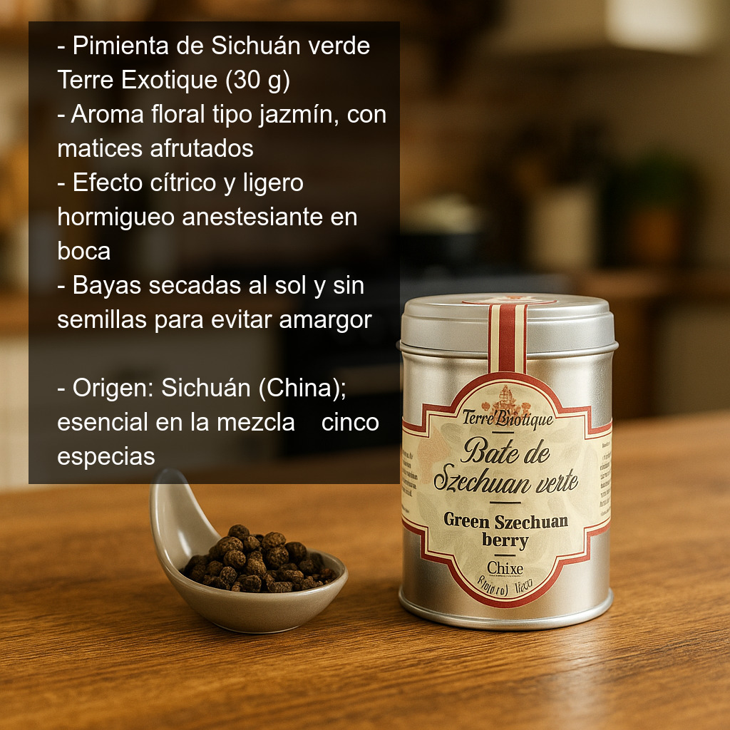 La pimienta de Sichuán verde (también escrita Sechuán) es una especia única y muy apreciada en la cocina asiática por su aroma floral y su característico efecto ligeramente anestesiante y cítrico en boca. Aunque se la conoce como “pimienta”, en realidad procede de las bayas de un fresno espinoso (género Zanthoxylum) originario de China. Para obtener un sabor limpio y elegante, las bayas se secan al sol y se limpian cuidadosamente para retirar las pequeñas semillas interiores, que pueden aportar amargor.