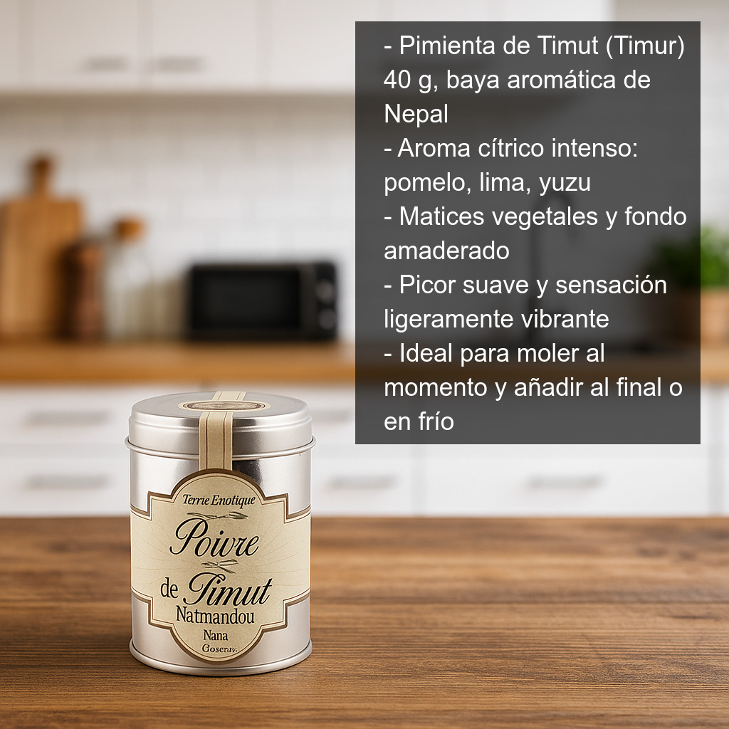 Recolectada de forma tradicional por los paisanos en zonas de altura y presente en los mercados de Katmandú, la pimienta de Timut destaca por un aroma intenso y complejo: notas cítricas (recuerda a pomelo y lima), matices vegetales y un fondo amaderado que aporta profundidad. En boca ofrece un picor suave, más aromático que agresivo, y una sensación ligeramente vibrante.