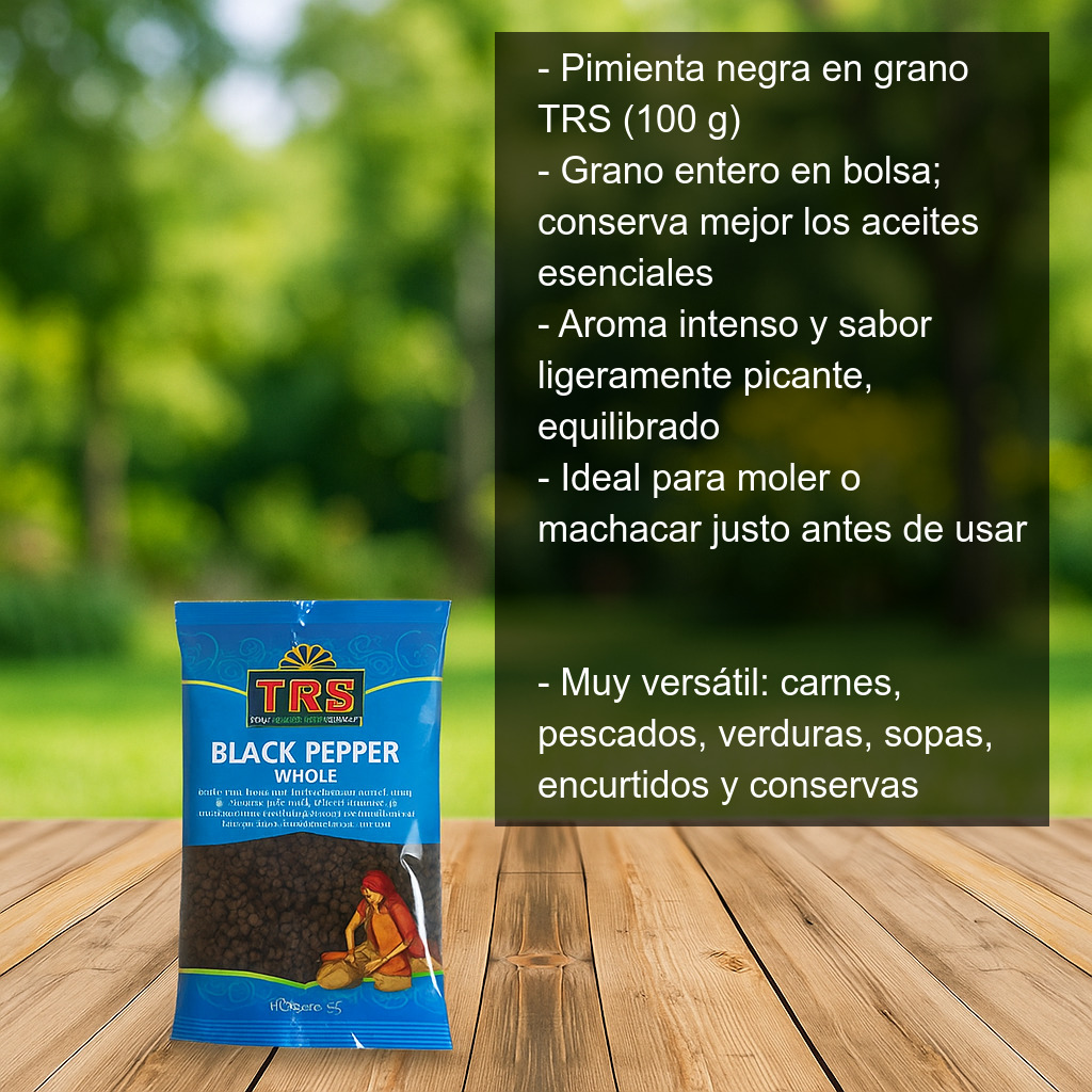 Pimienta negra en grano (100 g) de la marca TRS, presentada en bolsa y en grano entero. Una especia imprescindible en cualquier cocina por su aroma intenso, su sabor ligeramente picante y su capacidad para realzar y equilibrar el gusto de infinidad de recetas.