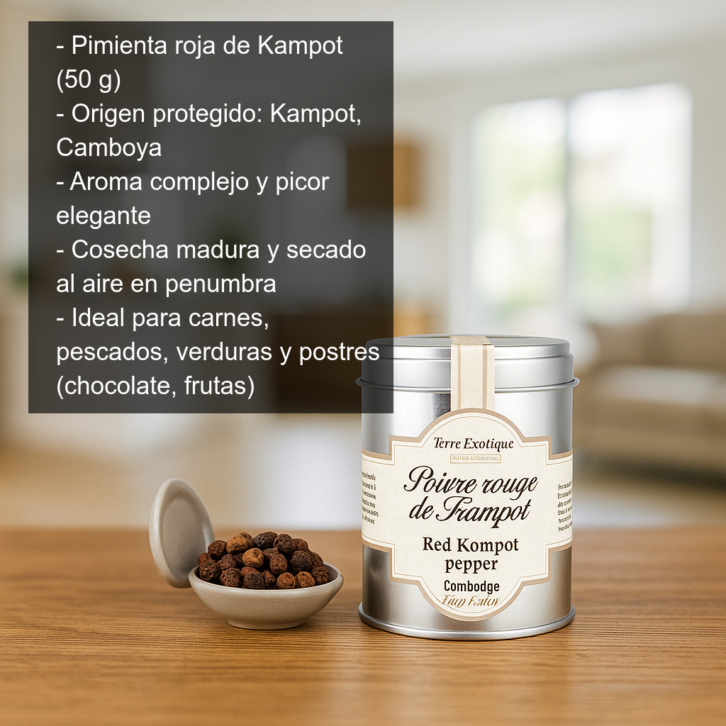 La pimienta roja de Kampot (50 g) es una de las especias más apreciadas del mundo por su aroma complejo, su picor elegante y su origen protegido en la región de Kampot, Camboya. El cultivo de la pimienta en Camboya comenzó en el siglo XIII y vivió su gran auge en el siglo XIX. Hoy, esta pimienta vuelve a ocupar un lugar protagonista en la alta cocina y en las despensas de quienes buscan un condimento excepcional.