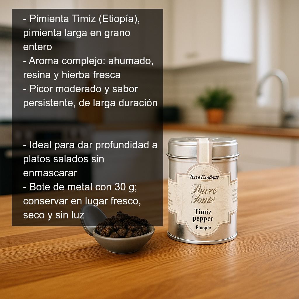 La pimienta Timiz es una especia endémica de Etiopía muy apreciada en la cocina africana por su perfil aromático único. Se trata de una pimienta larga (en grano entero) con un aroma complejo en el que destacan claros toques ahumados, notas de resina y matices de hierba fresca. Su picor es moderado, pero con un sabor persistente y de larga duración, ideal para dar profundidad a platos salados sin enmascarar otros ingredientes.