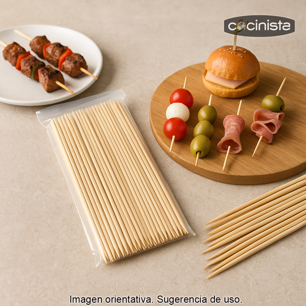 Bolsa con 100 pinchos de bambú de 15 cm, ideales para preparar pinchos, brochetas, aperitivos y presentaciones tipo catering. Estos palillos de bambú tienen un tamaño intermedio muy práctico: suficientemente largos para ensartar varios ingredientes y, a la vez, cómodos para servir y comer directamente.