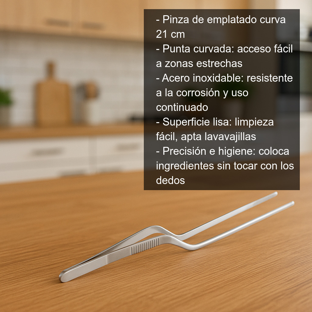 Si buscas una herramienta fiable para mejorar la presentación de tus platos, la pinza de emplatado curva 21 cm te ayudará a trabajar con más higiene, control y delicadeza en cada detalle.