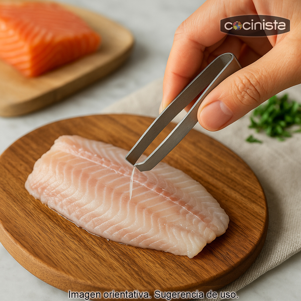 Para mejores resultados, pasa suavemente los dedos sobre el filete para localizar las espinas. Sujeta cada espina con la pinza lo más cerca posible de la base y tira con un movimiento firme en la dirección natural de la espina. Así conseguirás piezas limpias y listas para cocinar o servir.