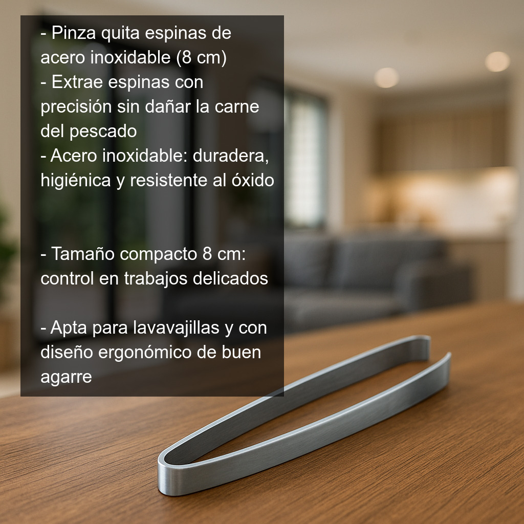 La pinza quita espinas de acero inoxidable (8 cm) es la herramienta ideal para retirar espinas del pescado de forma rápida, precisa y segura, sin romper ni dañar la carne. Imprescindible si cocinas con pescado fresco y especialmente recomendable para preparaciones donde el acabado debe ser perfecto, como sushi, sashimi, tartar, ceviche o lomos a la plancha.