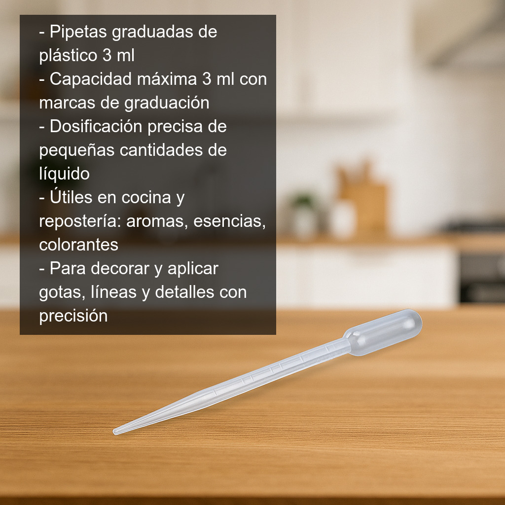 Pipetas de 3 ml de plástico graduadas para manipular y dosificar de forma controlada pequeñas cantidades de líquido con gran precisión. Cada pipeta tiene una capacidad máxima de 3 ml e incorpora marcas de graduación para facilitar la medición.